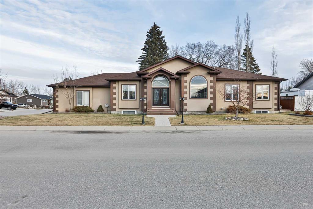 Introducing this stunning bungalow, boasting nearly 2400 sq. ft., located in the charming town of Vulcan, Alberta. Situated on a corner lot with a triple car garage, this home exudes elegance with its acrylic stucco exterior and captivating street appeal. As you step inside through the double doors, you'll be greeted by a spacious foyer that offers a glimpse of the open concept living space on the main floor. The grandeur of the 12-foot coffered ceilings, complemented by a large skylight and ample windows, fills the area with natural light. The kitchen is a chef's dream, featuring a side-by-side fridge freezer unit, a gas range, a stylish granite sink, and expansive granite countertops. The extra-tall cabinets perfectly align with the high ceilings. The focal point of the living room is the fireplace, adorned with a generous mantle and hearth, and surrounded by windows that bathe the space in warmth and natural beauty. The meticulous attention to detail is evident in the bulkhead design, custom oak woodwork, and solid oak doors throughout the home, equipped with transoms to enhance the flow of light. The main level boasts a large primary bedroom with a coffered ceiling, a spacious walk-in closet, and an ensuite complete with a double vanity, a soothing double soaker tub, and a luxurious walk-in shower with multiple showerheads. Adjacent to the kitchen is a convenient walk-in pantry, and tucked away in this area is another sizable bedroom with a full bath. As you make your way to the triple car garage, you'll find a hallway offering abundant storage options. The garage itself is drywalled and painted, but its standout feature is the in-floor heating. Not only does the garage benefit from this cozy feature, but the entire basement as well. Descend to the basement, where a custom wood and iron railing guides you into the expansive space. This level presents a generous living room with a laminate dance floor, perfect for entertaining or accommodating a pool table. Additionally, a dedicated movie theater room awaits, complete with a screen and projector. Another bedroom with an adjacent full bathroom and a roughed-in area for a future sauna or extra storage space completes this level. An exciting bonus of this home is the presence of an illegal suite in the basement. This self-contained living space features a large living room, a spacious bedroom, an in-suite laundry, and a full bathroom. Conveniently, the suite also has its own side entrance for added privacy and accessibility. Experience the charm of small-town living with the convenience of a nearby hospital, grocery stores, schools, and all necessary amenities. Don't miss out on the opportunity to call this exquisite bungalow home. Contact your preferred realtor today for a showing!