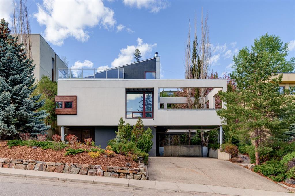 Nestled on a private .22-acre lot in sought-after Elbow Park, this architecturally significant Jeremy Sturgess executive family home offers a harmonious blend of captivating design and natural beauty. From the moment you arrive, the meticulously landscaped grounds and mature foliage set an inviting tone, while Canmore artist Tony Bloom's custom copper door welcomes you into a realm of refined elegance. Inside, the visionary interior design by Douglas Cridland captivates with its interplay of light and space. Vaulted 20-foot beamed ceilings soar above radiant concrete floors, complemented by extensive maple millwork throughout. Entertain guests in the living room, where a wood-burning copper-faced fireplace beckons and two expansive balconies offer panoramic river views. The chef’s kitchen is a culinary haven, featuring top-of-the-line appliances and a generous breakfast bar. The two-story dining room, adorned with a skylight and another copper-faced fireplace, sets the stage for memorable gatherings. A distinguished office with custom woodwork completes the main level. Upstairs, the master retreat awaits, boasting vaulted ceilings, a spa-inspired ensuite with a soaker tub and a glass shower PLUS an extensive rooftop patio. Two additional bedrooms with a shared bath are perfect for kids, grandkids or those special guests. The lower level offers versatility, with a media room, laundry facilities, mudroom, and direct access to the attached garage. Conveniently located just steps from the Glencoe Club, Calgary Golf and Country Club, Elbow Park School, and scenic river pathways, this unique residence offers easy access to downtown and the vibrant amenities of Mission, Britannia, and Marda Loop. Discover a lifestyle of unparalleled luxury and convenience – this home is truly one of a kind.