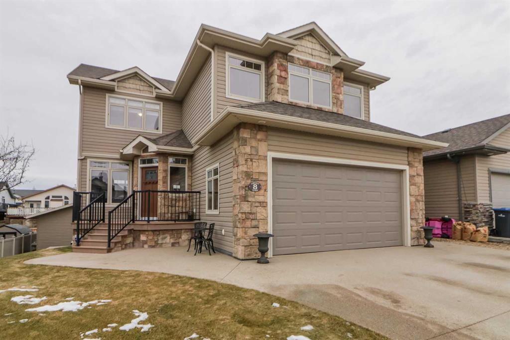 4 BEDROOM, 4 BATH FULLY DEVELOPED WALK OUT WITH ATTACHED & DETACHED GARAGE!! Nestled in a quiet close, this elegant home exudes timeless charm. Graced with meticulous landscaping with underground sprinklers, the exterior boasts a welcoming ambiance with the Dura Deck, exposed aggregate driveway, and custom front door. Newly renovated and thoughtfully designed, this home has it all. Upon entry, the inviting foyer with gleaming hardwood floors and tasteful ceramic tile and high ceilings sets the tone with the open concept living room complete with a gas fireplace, dining area, and kitchen. The kitchen cabinets are custom with granite countertops, new sink and faucets, and newer appliances including an induction range, soft close cupboards, and a pantry with shelving for organized storage. Enjoy the door onto the back deck for private BBQ'ing overlooking the vinyl fenced yard. The laundry and 2 piece bath finishes off the main floor and leads to the double attached garage. There is room for everyone in this home as the upstairs has a very large family room with surround sound, a 4 piece bath with new granite countertops, plus 3 nicely sized bedrooms. The spacious Primary bedroom has a 5 piece ensuite with a custom built shower including a rain head, double sinks, granite counter, and a walk-in closet with built in organizers. The walk-out basement has an open games room, an additional bedroom with an amazing walk-in closet, plus a beautiful 3 piece bathroom. There is Central Air and the windows have custom blinds throughout this lovely home. Step outside to the private yard with back alley access, and into the separate flawless 22x24 heated dream shop constructed in 2016. This versatile space comes equipped with a 40,000 BTU heater, 220 wired, 2x6 construction, 10 foot ceilings, 9 foot door and epoxy floors. Recent upgrades include fresh paint on the main and upper floors, a new hot water tank in 2023, and shingles in 2017. Experience comfort, luxury, and convenience in this home at 8 Liberty Place!