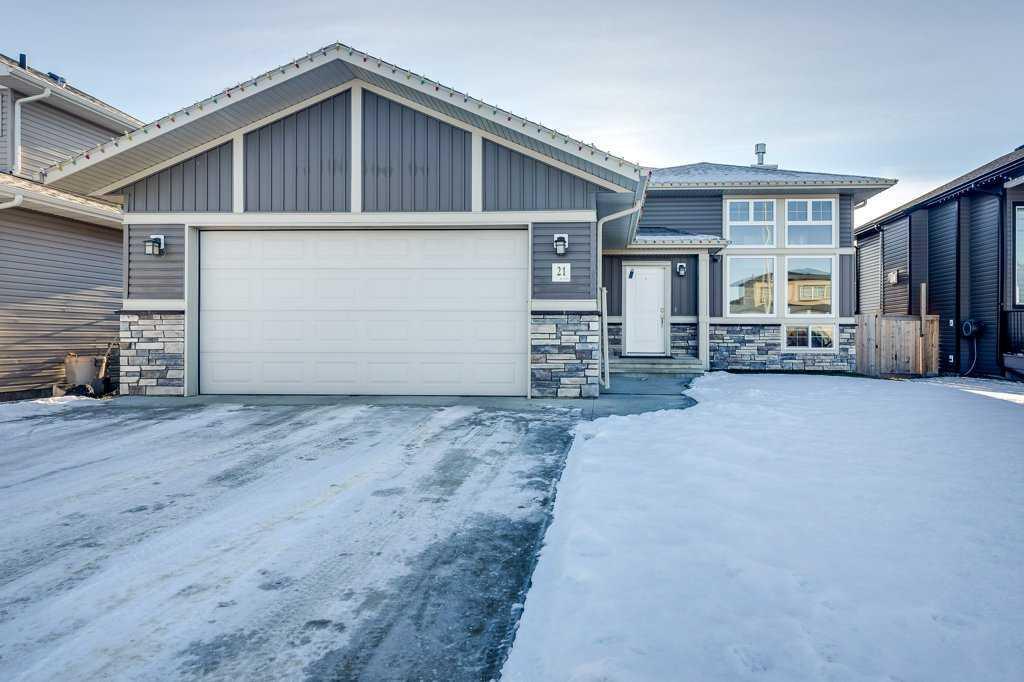 Welcome to 21 Arrowwood Close! This modern and elegant home starts with a heated front garage with ample space for 2 vehicles. The front entrance will welcome the new owner with plenty of WOW factor with a huge tiled foyer accented by large front windows. The main level is defined by fabulous glass railing, quality vinyl flooring, and a feature gas fireplace. Natural light floods through the main level, and the open concept space is perfect to enjoy time with family and friends. The kitchen is thoughtfully designed with contemporary white cabinetry, stainless appliances and a large center island. The dining space at the rear is connected to patio doors with easy access to the south facing rear deck with gas line for your BBQ. There are 2 bedrooms and 2 baths on the main level including the master bedroom with it's own 4pce ensuite and walk-in closet. The WALK-OUT basement is fully and professionally finished with a huge rec room, infloor heat, hi-efficiency furnace and tank, a full bath and 2 additional bedrooms! The large yard is fully fenced and landscaped, the playset stays as well as the storage shed!