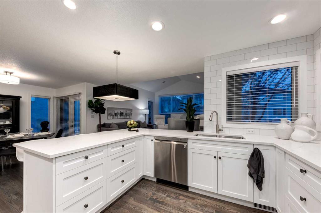 Welcome to this Evergreen south facing two-story home with fully finished basement, creating 2261 square feet of inviting space. Extensively renovated in 2023 this 3 bedroom, 4 bathroom home has been redesigned with bright open main floor plan. It features a classic WHITE kitchen, white quartz countertops including a spacious eating bar. Connected is the dining room leading to double glass doors opening onto a substantial WEST facing deck ( gas hook up for BBQ ) and fully landscaped backyard with a large oval stamped concrete patio, gas fire pit and lovely mature trees ( 2 apple ) for cozy backyard privacy. The living room has a vaulted ceiling and gas fireplace surrounded by top to bottom windows with full outlook to the backyard. The entire main floor has flowing solid OAK flooring, including the 2 piece powder room. Upstairs, enjoy the KING size primary bedroom with oversize windows, glass shower, soaker tub, dual sinks. Separating this bedroom from the other two is the laundry room, with a full bathroom between the secondary bedrooms. The lower level has in-floor heating throughout the recreation room with outstanding built in cabinetry, wet bar, fridge, desk, all with granite counters. There is also a 3 piece bath with steam shower and shelving. All mechanics well serviced including CENTRAL AC. The front double garage also has in-floor heating, a new coat of epoxy and great storage. Close to schools, Fish Park, and shopping!