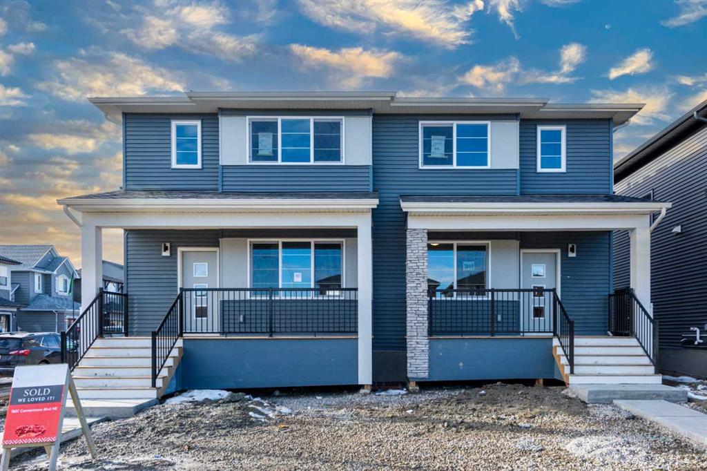 ****BACK IN TO THE MARKET DUE TO BUYERS FINANCING NOT APPROVED**** BRAND NEW/ NEVER OCCUPIED/ **CORNER LOT**!! Welcome to this beautiful Corner Lot 1657sqft Duplex. with all modern touches and upgrade. Excellent home in the most favorite north east community of CORNERSTONE. This attractive open floor plan home comes with lot of features and up grades. The main entrance leads to the very big front facing living room. The gorgeous modern kitchen overlooks both the dining room and living room with a very wide and bright window. Kitchen features with beautiful centre island , Espresso cabinets, stainless steel appliances, beautiful big pantry. Access the deck and backyard through the mud area right beside the kitchen. Also you will find powder room next to the back entrance. Very nice stylish stairs lead you to the upper floor which consists of three good size bedrooms and bonus room . Primary bed with 3 pc ensuite and walk in closet and an other common bath complete this wonderful upper floor plan of this gorgeous duplex. Basement side entrance ,roughing and two good size windows waiting for new owner ideas.