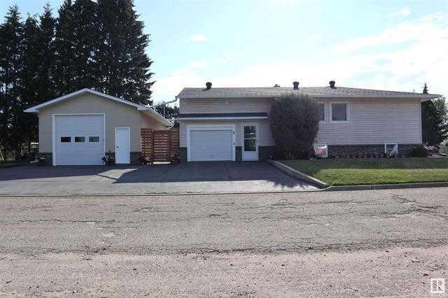 Very well kept four bedroom, two bath, 1592 sq. ft. 3 level split located on a huge 50’ x 150’corner lot in Thorsby. Paved driveway, large garden area. 20’x 32’ detached garage with power, insulated, heated and stucco siding. RV parking. Attached single garage. Enclosed patio area. Kitchen upgrades in 2010 – complete reno. Large living room, adjacent dining room, main floor bedroom. Upper level features two bedrooms and bathroom. Basement has games room/bar, 4th bedroom and 3 piece bathroom, utility area. 100 amp electrical upgrade 2018. Furnace replaced in 2006. Shingles replaced in 2018. New water and sewer lines in 2022.