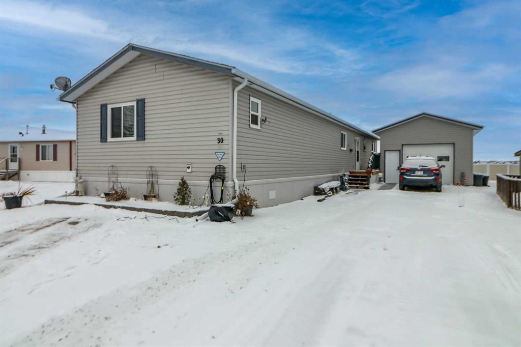Classy Four Bedroom Home! This spacious Modular Home Features a bright white kitchen with a breakfast bar/Island. Attractive appliances include the Panasonic microwave. Open concept dining and living, with a BBQ deck off the dining area. The Primary bedroom is spacious with a walk in closet and new upgraded ensuite. Three more bedrooms for your family and another full bathroom. You will love the NEW GARAGE (16 x 24) which is insulated, boarded, painted and heated!! There is a rear west facing deck and a large shed. The dura deck and wrought iron railings were new in 2022. New quartz counter top on the island, newer silicone sink and tap, newer faux wood blinds in the kitchen/living room, and primary bedroom. Vinyl plank flooring throughout with carpet in the Master Bedroom. Don't miss this well maintained home in a premier park!