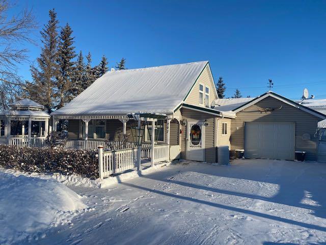 Come and enjoy rural living with this one 1/2 storey home in Alliance. Enjoy the private yard surrounded by evergeens from the wrap around deck. The main floor offers a mudroom, living room with gas stove fireplace, dining room, country kitchen with island and eating area and a 2 piece bathroom with main floor laundry. Upstairs is bright and has a primary bedroom with walk in closet, another bedroom and 4 piece bathroom. The wood basement is insulated and finished with a family room, a 3 piece bathroom and a room currently used as a bedroom but would be perfect for an office or craft room. Home has been freshly painted and the exterior and interior cleaned up. Outside has so much to offer on the two lots, there is a perennial garden, fruit trees. You can enjoy the yard from anywhere on the impressive wrap around deck with veranda and gazebo! One of the cutest homes in town. You won't want to miss this!