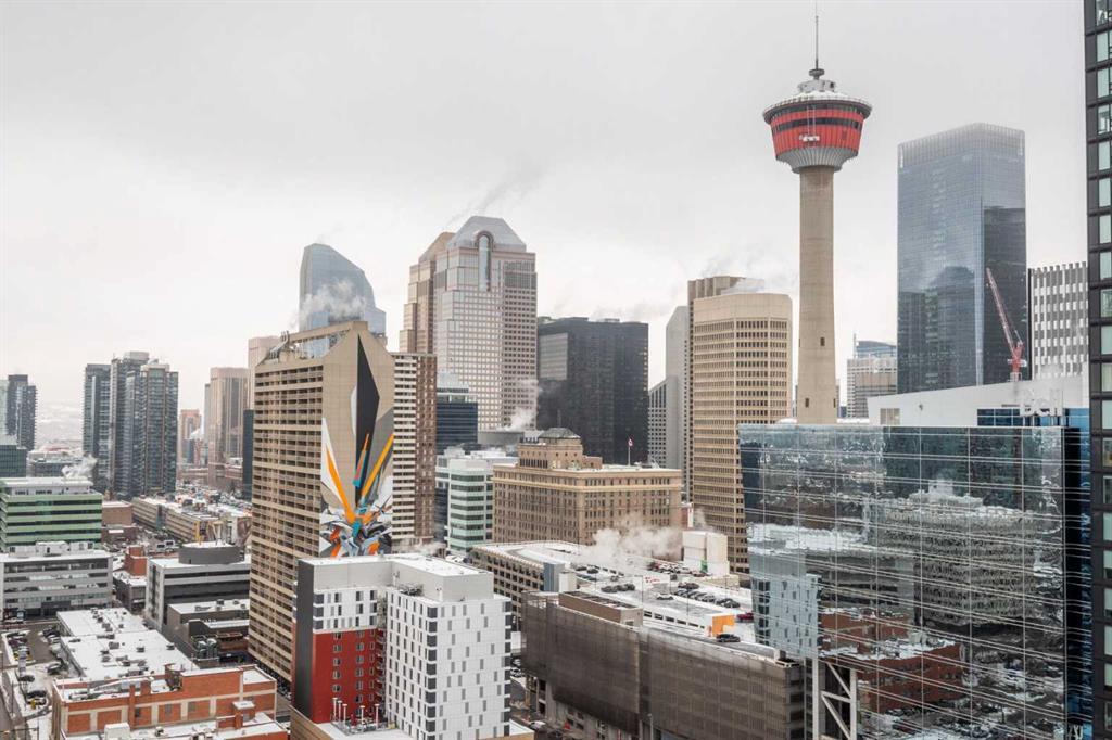 Seller request no showings while c/s. Indulge yourself in upscale contemporary living in this amazing, 2-bedroom, 2-bath condo at one of Calgary's premier residences, Keynote 2.  This executive 24th floor corner unit offers stunning west mountain views.  Abundant floor-to-ceiling windows allow natural light to permeate throughout . Form and function meld beautifully together to offer a well-designed open concept living space.  Boasting a stylish kitchen with full height cabinetry with extended granite island ; should inspire both the occasional and seasoned cook.  Ample living room is perfect for relaxing, entertaining & enjoying the view.  Access to the balcony, great for BBQ.  Perfect privacy with two separated bedrooms, each with their own Ensuite. In-suite stacked Laundry. Secured, heated, titled parking & titled storage. Experience the ultimate Keynote living where every detail has been carefully considered for your comfort and lifestyle.  You will have access to a plethora of first-class amenities such as a well-equipped fitness center, rooftop oasis w/BBQS, owners lounge featuring TVs, pool table & kitchen, , 2 guest suites + secured bike storages.  For your convenience, attached to the building you will find retail services, Sunterra, and a wine store. Prime location in the heart of Beltline, walking distance to cafes, casual & fine dining restaurants, LRT, groceries, entertainment venues, Saddledome, casino and Central Memorial Park.  Invest in the Keynote 2 lifestyle & enjoy the epitome of luxury urban living.