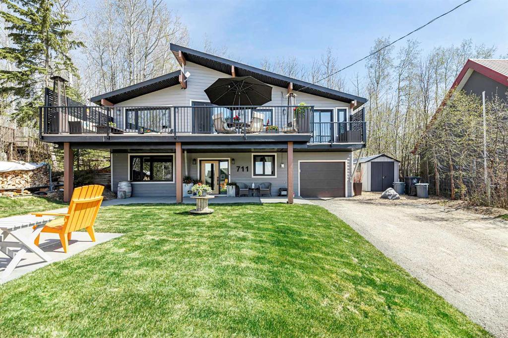 Nestled along the tranquil shores of Sunbreaker Cove, Alberta, this haven promises a lifestyle of modern luxury and scenic serenity. Boasting an unrivaled location across the street from lakefront in a quiet cul de sac, the property features an array of recent upgrades and standout amenities, making it an idyllic retreat for those seeking the perfect blend of comfort and entertainment where the furniture and fixtures are included, PLUS 1/3 of the DOCK. The exterior impresses with its newly installed hardy board and fresh roofing. Inside, this home has undergone a comprehensive interior transformation. Recent updates include new paint, flooring, doors, windows, lighting and baseboards throughout. Step through the brand new front door into the bright family room/games room. Bring the whole family to enjoy the large 3 bedrooms on this main floor plus the beautiful 4 piece bathroom. Heading upstairs to the kitchen which is a culinary masterpiece incuding under counter lighting, custom cupboards, pullouts, quartz countertops, moveable island, and top-tier appliances, featuring a Thermador fridge and a gas Fulgor Milano range. The dining room seamlessly connects to the outdoors through new patio doors. Two more bedrooms on this level offers ample accommodation, with the primary bedroom featuring a walk-in closet and 3 piece ensuite. Luxurious Maxxmar custom blinds grace the living room, dining room, and games room windows, creating an elegant and functional living space. Two gas fireplaces provide warmth and ambiance, ensuring cozy evenings with family and friends. Additional features include a new furnace, hot water tank, humidifier, water softener, A/C, alarm system, and security cameras for peace of mind. Outside the meticulously landscaped back yard is adorned with rubber mulch, artificial grass, perennial plants, ambient lighting and and an 8-person hot tub. The front 46 foot spacious deck allows spectacular lake views with privacy screens on each side, and GEMSTONE lights. Enjoy lake access just steps away adding to the allure of living by the water. The garage, equipped with electric heating and new door and opener, complements the property's convenience. Two large sheds offer additional storage, and a prepared foundation with crushed gravel awaits the potential addition of a double garage. This Sunbreaker Cove gem offers a unique opportunity to embrace lakeside living at its finest—a harmonious blend of modern sophistication and the beauty of nature. Don't miss the chance to call this remarkable property home. This can be all yours including the furniture and fixtures!