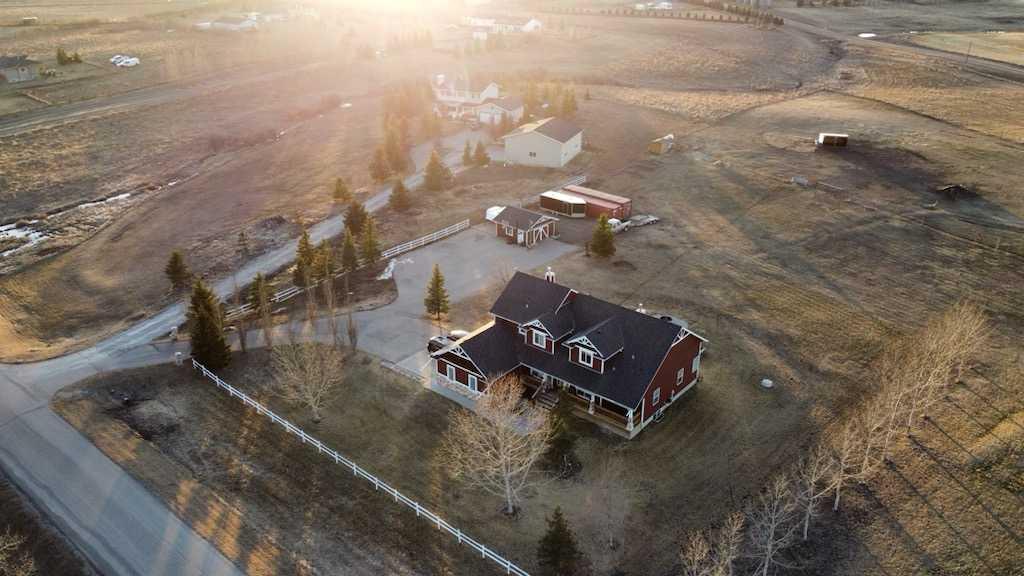 Nestled within the picturesque Prairie Royal Estate of Rocky View County, this extraordinary 4-acre property showcases a magnificent two-story residence encompassing over 3000 square feet. With 4 bedrooms, each accompanied by its own ensuite, and a convenient half bathroom on the main floor, this residence seamlessly blends refined elegance with practical sophistication. Upon entering and past the dining room and den, the main living room takes center stage – a harmonious space featuring high ceilings and expansive windows, offering a perfect balance of comfort and style, ideal for both relaxation and entertainment. Positioned strategically on the main level, the primary bedroom serves as a private retreat. Boasting his and her's walk-in closets, a shower, tub, and dual sinks, it captures luxury and convenience. The northwest-facing window in the primary bedroom frames breathtaking views of the landscape, providing a daily spectacle of natural beauty and captivating sunsets. The kitchen serves as a functional hub where families can gather for everyday meals and practical cooking needs. With its well-designed layout and essential appliances, it provides a space for the routine activities that keep a household running smoothly. An induction cooktop strategically placed by a window captures scenic views, complemented by a substantial built-in refrigerator/freezer, built-in oven, built in dual purpose microwave/oven, and dishwasher. A spacious dining room completes this culinary haven, offering an elegant setting for hosting guests or enjoying family meals. Ascending to the upper level, an office space and two additional bedrooms, each with an ensuite, provide a private and comfortable retreat for all occupants. The basement unfolds as an entertainment haven, featuring a theater room for family and friend gatherings, two rec rooms for larger social occasions, and a conveniently placed dry bar. Externally, the property showcases an attached triple car oversized garage, an oversized parking pad, and a pickleball court, offering recreational amenities. A heated workshop with a wood furnace caters to versatile needs including its use as a single car garage, while two 40 feet sea cans deliver ample storage solutions. For equestrian enthusiasts, the property incorporates a horse shed, and a feed storage, and for the kids, a play structure. This Prairie Royal Estate residence transcends the ordinary; it embodies a lifestyle of refined luxury, tranquility, and scenic beauty. Arrange a private viewing to fully appreciate the grandeur of this retreat and envision making it your own.