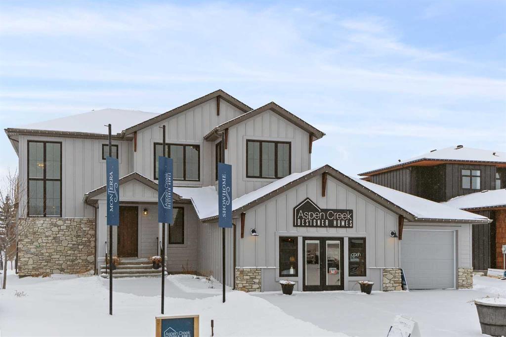 Open house times are Monday - Thursday 2-8 and Saturday & Sunday 12-5. Step into this executive custom built showhome in the prestigious new community of Monterra at Cochrane Lakes. The Adeline, built by Aspen Creek Designer Homes is a perfectly crafted 2 storey home with endless upgrades that combine both function and design. Walking into this estate home, you will be greeted with an abundance of natural light pouring in through the large windows throughout the bright and open floor plan. The large foyer leads into a wide open living room with a cozy gas fireplace and a reading nook in the window. The oversized kitchen is a chef's dream with top of the line stainless steel appliances such as a Bertazzoni 5 burner gas range, a custom built range hood and a built-in microwave and oven. The kitchen is furnished with Dekton backsplash and Silestone quartz countertops which makes for a long lasting luxurious feel. The large dining room is just off of the kitchen with large windows and doors leading out to an open deck. A large den can be found off of the kitchen that features a custom accent wall, perfect for a home office. The walk through pantry comes equipped with ample storage space and built-in shelves. The pantry leads out to the large mudroom with built-ins and heated tile flooring for the cold winter months. The mud room has an entrance to an oversized triple attached garage with baseboard heating and ample space for storage. The staircase heading upstairs leads you to a large bonus room, great for family gatherings. The upper level has 9' ceilings throughout and 8' doors making for a spacious and open floor plan. The upper level also has 2 good sized bedrooms, one with a window reading nook with built-in storage. The main 5 piece bathroom has Silestone countertops, heated tile flooring and double vanities making for a large sharable space. The primary bedroom is where luxury meets functionality in this beautifully designed layout. The large room has built-in reading lamps for added convenience. Through the refurbished barn door, you'll enter the luxurious 5 piece ensuite with designer heated tile flooring and a large standalone bathtub. The walk-in closet doubles as a dressing room and has built-in storage and even a laundry chute that leads into the laundry room next door. The laundry room is conveniently placed on the upper floor with a sink and storage. The large basement is ready for development and provides an opportunity for future expansion. This home has been thoughtfully crafted with design and functionality in mind. The Monterra neighborhood is perfect for the growing family. Just a 5 minute drive from Cochrane and close proximity to the beautiful Rocky Mountains. You must see this home to appreciate its beauty and thoughtful design. Exceptional value!
