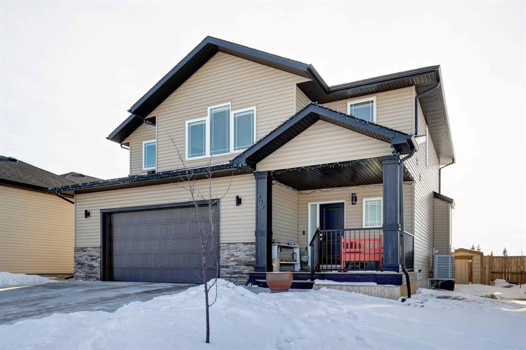 Nestled at 709 Fairways Drive in Vulcan, Alberta, this exquisite two-story residence, constructed in 2019, invites you into a world of modern elegance and comfort. The home boasts a thoughtful design with meticulous attention to detail, offering a blend of luxurious features and practicality. Ascending to the second level, you'll discover a well-appointed layout with two bedrooms and a shared bathroom, perfect for accommodating family or guests. The primary bedroom is a sanctuary with a spacious walk-in closet and a full ensuite bathroom, providing a private retreat. A cozy family room on this level adds a welcoming touch, creating a versatile space for relaxation. The laundry room is conveniently located on the second level as well. The main level showcases an open concept design that seamlessly integrates the kitchen, dining room, and living room. The kitchen is a chef's dream, equipped with modern appliances and adorned with sleek finishes. The living room, anchored by a natural gas fireplace, exudes warmth and comfort, creating an inviting atmosphere for gatherings. Engineered hardwood floors grace the living spaces, while ceramic tiles add a touch of sophistication. A deck off the dining area extends the living space outdoors, offering a serene spot to enjoy the scenic surroundings. The well-manicured backyard provides a perfect setting for outdoor activities and entertaining.