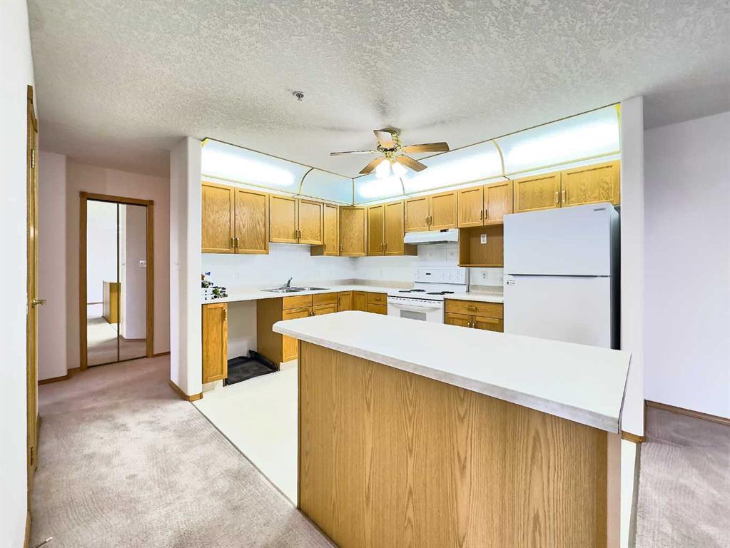 Affordable and meticulously maintained 2-bedroom, 2-bathroom, 1021 sq. ft. unit located in the popular 55+ community of Grandview Village. The unit has an open-concept main living area seamlessly connecting the kitchen, dining area, and living room. From the living room, you have access to your own private, covered balcony. The large primary bedroom features walk-through double closets leading to the 3-piece ensuite. Additionally, you'll find another nice-sized bedroom, a well-appointed 4-piece bathroom, and an in-suite laundry room with storage cabinets for added convenience. The whole unit has been freshly painted a neutral colour! The condo fees of $595.29 include all utilities, one underground parking stall, one assigned storage space, common area maintenance, and access to the array of amenities the building has to offer, including the indoor pool and hot tub, an outdoor patio area with barbecues, a library, a games room, a car wash, a workshop, a party room, and guest suites. There is RV parking upon availability. To top it off, the building is within walking distance of shopping, medical offices and pharmacies, banks, public transit, a golf course, restaurants, grocery stores, and much more! Don’t miss out on this affordable opportunity for maintenance-free and worry-free living. Call today to view!