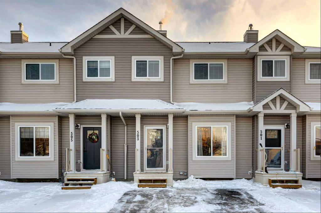 View the 3D Tour (Purple House Symbol) Updated Townhome with a Fully Fenced private Yard and Two Parking Spaces in the Pet Friendly complex (up to Two Pets with board approval) in Strathaven! Clean, Bright & Beautiful! New luxury vinyl plank flooring throughout the main floor. The living room features a black tile surrounded fireplace. Open and spacious floor plan with the living area being open to the kitchen. The kitchen has a current color palette, white and blue cabinetry with beautiful gold hardware and black & stainless steel appliances including a new dishwasher 2023. Glass door off kitchen to the sunny South backyard. The powder room is conveniently located by the back entry. On the upper floor you'll find two large bedrooms with the primary bedroom with access to the main bath (cheater ensuite). The lower level has good ceiling height and is unfinished awaiting your final touch to finish to give you added living space. Furnace 2013. Only a 5 to 10 minute walk to All level of Schools, Wheatland Elementary School, Crowther Memorial Jr High School and Strathmore High School. Just steps to Strathmore Aquatic Centre, Family Center Arena, Curling Center, Skate Park, Parks, Playgrounds & Pathways and the Strathmore Hospital. Short drive to shops, stores, and restaurants. Strathmore, a lovely town that has all the amenities that you need and close to Calgary too! Welcome home!