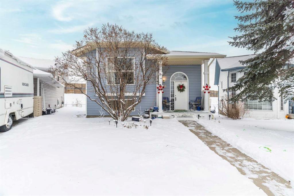 A great 4 bedroom, 2.5 bathroom bi-level detached single family home on pie shaped lot backing onto park and bike path with WALK-OUT lower level! The cul-de-sac location is super for kids as there is no through traffic. The lot can also be accessed from the rear lane and is spacious enough to allow for a really nice garage to be built. There are established gardens and a yard shed plus full landscaping front and back. This home is 1/2 block to playground and very close to schools. & daycare. Upstairs has two bedrooms and 1.5 bathrooms, a large front family room, kitchen and eating area. There is a BBQ deck off the dining area and sturdy stairs down to grade. The basement is temporarily separated off via a drywalled closed passage at the bottom of the stairs but is easily reversible. The lower level is very bright due to it's large windows,. There are two bedrooms, a bathroom, laundry and a very large second family room. Nicely maintained with a newer direct vent furnace and hot water tank; PLUS vinyl windows, siding and shingles which were all replaced 2014! One of the most affordable homes in Airdrie! Book your viewing today. May 01 possession.
