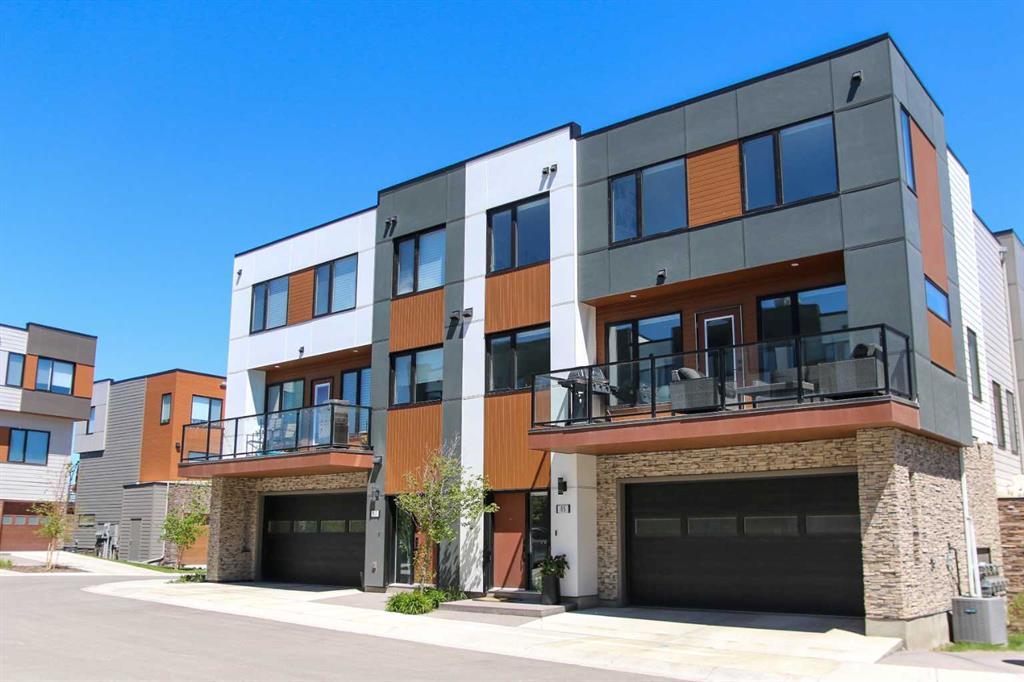 **JUST LISTED!** AMAZING urban retreat - 2-BEDROOM TOWNHOME with DOUBLE FRONT ATTACHED GARAGE plus many CUSTOM UPGRADES! Nestled in the new community of Trinity Hills, this meticulously upgraded townhome presents a harmonious blend of modern luxury and urban convenience. Boasting DUAL PRIMARY SUITES, each with lavish 4pc ENSUITES and walk-in closets, this premium END UNIT offers the epitome of contemporary living. Enjoy tranquil living, the unit is located along a QUIET INNER STREET, shielded from the bustling main road with BRIGHT SOUTH exposure. Upon entry guests are greeted to a warm entrance, with a laminate staircase leading to an expansive open concept living space adorned with premium finishes. Sun-soaked interiors, thanks to oversized windows, illuminate the luxurious plank flooring, setting the stage for lively gatherings and serene relaxation. The heart of the home, the kitchen, is a culinary dream featuring sleek flat-panel cabinets, QUARTZ COUNTERTOPS, designer tile backsplash, and matte black hardware. Equipped with premium stainless-steel appliances, including a GAS RANGE and custom hood fan, and complemented by a spacious island with seating, this kitchen is a chef's delight. Entertain with ease in the generous dining area and living space, enhanced by 9ft ceilings, modern neutral tones, and custom window coverings. Step through the garden door onto the expansive balcony, equipped with a gas BBQ connection, perfect for alfresco dining and soaking in sunny views of Canada Olympic Park and Paskapoo Slopes. The upper level unveils a serene primary retreat, complete with a cozy nook, custom tiled walk-in shower, and tile flooring. The second bedroom, equally spacious, boasts a walk-in closet, private access to a pristine 4-piece bathroom, and a separate laundry closet. Additional highlights include CENTRAL A/C, and both a storage room and utility room in the partially finished insulated garage. Take the neighbourhood by foot from convenient shopping at Save-On-Foods to energizing workouts at GoodLife Fitness, and everything in between including Dollarama and PetSmart. Immerse yourself in the beauty of nature with scenic hiking and biking trails steps outside your home, offering endless opportunities for outdoor exploration. Seamless connectivity awaits with easy access to major roadways, a short 15-minute commute to downtown Calgary and easy access to the Rocky Mountains. This meticulously maintained home offers a lifestyle of unparalleled comfort and convenience. Seize this opportunity to experience urban living at its finest - schedule your showing today!