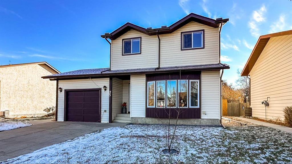 Amazing location. This family sized home backs onto Dinosaur Sledding Hill and is within walking distance of schools and recreation areas. Many updates already completed in this home include: windows in 2016, Hot Water Tank in 2018, furnace in 2014, new siding in 2018, new roof in 2018 and updated bathroom in 2018. Newer kitchen cabinets were added in 2016. As you enter you are greeted with an open floor plan that showcases a massive living room and formal dining room on the right and a sunken main floor family room on the left. This oversized family room is perfect for a pool table or games area or a cozy tv retreat. A large bay window adds light and overlooks the front yard. Enjoy family dining in the eat-in kitchen that also features a bay window adding additional space for the table and chairs. A newer kitchen with gleaming cabinets and counters has been meticulously cared for. White appliances include a newer fridge, dishwasher, built in microwave and ceran top stove. A full sized pantry and easy care tile flooring complete this family oriented kitchen. A two piece bath is next to the rear entrance. Upstairs features a large primary bedroom with a 3 pc ensuite bath, two other bedrooms, a four piece bath and linen closet. The ensuite has a lovely walk in shower. The lower level is family focused with a large recreation area oodles of storage and a developed area that could be outfitted as another bedroom. An oversized double heated garage offers covered secure parking and there is a double swing gate for RV parking. Backing onto green space your family will enjoy the winter sledding and summer ball games this massive park offers. This move in ready home is available for quick possession. Call your favorite realtor today.