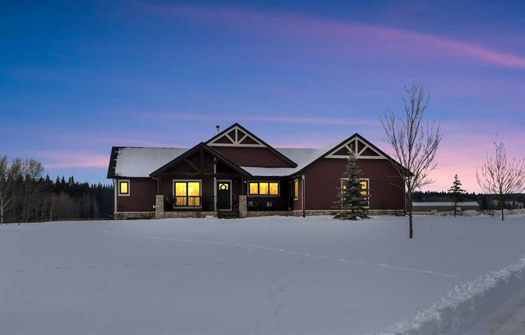 Stunning 2018 bungalow situated on 5 acres, boasting expansive views and privacy, just a little over 15 minutes north of Cochrane. This home is flooded with natural light, and framed by breathtaking views from every window. The main floor welcomes you with vaulted ceilings, an inviting wood stove, and an open layout which seamlessly blends the kitchen, living, and dining areas. The well-appointed kitchen offers a farmhouse sink, counter-depth fridge, dual fuel oven, sizable island with seating, and a walk-in butler's pantry with additional counter space and extra storage. Adorned with beautiful ash hardwood and modern lighting the main level also presents a spacious office or potential bedroom with a sliding barn door. This level includes a bright second bedroom and generous full bath with a vanity area and built in linen shelving. The primary suite features a spa-like bathroom with a freestanding soaker tub and oversized tiled shower. Each space showcases tasteful accents. Additional conveniences on this floor include a laundry closet with storage shelving & clothes hanging bar, thoughtfully decorated half bath with tiled feature wall, and hooks for outdoor gear storage in the generous mudroom. The lower-level rec room features enlarged sunshine basement windows with remote powered blinds, custom built-in bookcase with lower cabinetry, brick feature walls and an exquisite wet bar area. This Modern Industrial inspired space features insulated vinyl plank flooring throughout, two more expansive bedrooms, a versatile home gym space, a spacious utility room for storage, and a luxurious three-piece bath complete with built in linen shelves, electric in-floor heat, fully tiled feature wall and a walk-in tiled shower. Revel in the morning sunrises on the East facing front porch and experience breathtaking sunsets from the large back deck overlooking the fields and nearby forest. Low-maintenance landscaping has been completed and includes raised garden beds with many blooming perennials and trees. Tasteful stone retention and accenting has been added to the various exterior transitions around this home and to the picturesque firepit area. The property, mostly fenced, boasts a private location with R-RUR zoning, a 15-gallon-per-minute well, and a trench for a future shop water line. No detail is overlooked in this exceptional home—explore the immersive 3D tour and YouTube video for a closer look. No open house Sunday