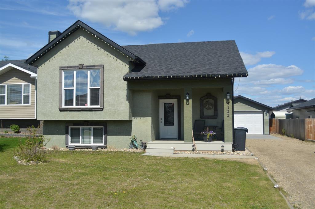 Come and take a tour through this newer gorgeous bi-level located in Shaftsbury Estates Peace River. This home provides beautiful curb appeal, boasts stucco and vinyl exterior, covered veranda in the front, covered deck in the back, fully landscaped, detached double car garage, large driveway and fully fenced backyard. Visit this home any day, it's in immaculate condition. Pride of ownership is readily apparent here - you have a entryway with high ceiling, 4 bedrooms, 2 bathrooms, fully developed up and down, fireplace in the living room, cathedral ceiling, open concept layout, ceramic tile, hardwood and carpet flooring, fully finished home with a layout that is attractive with a warm design