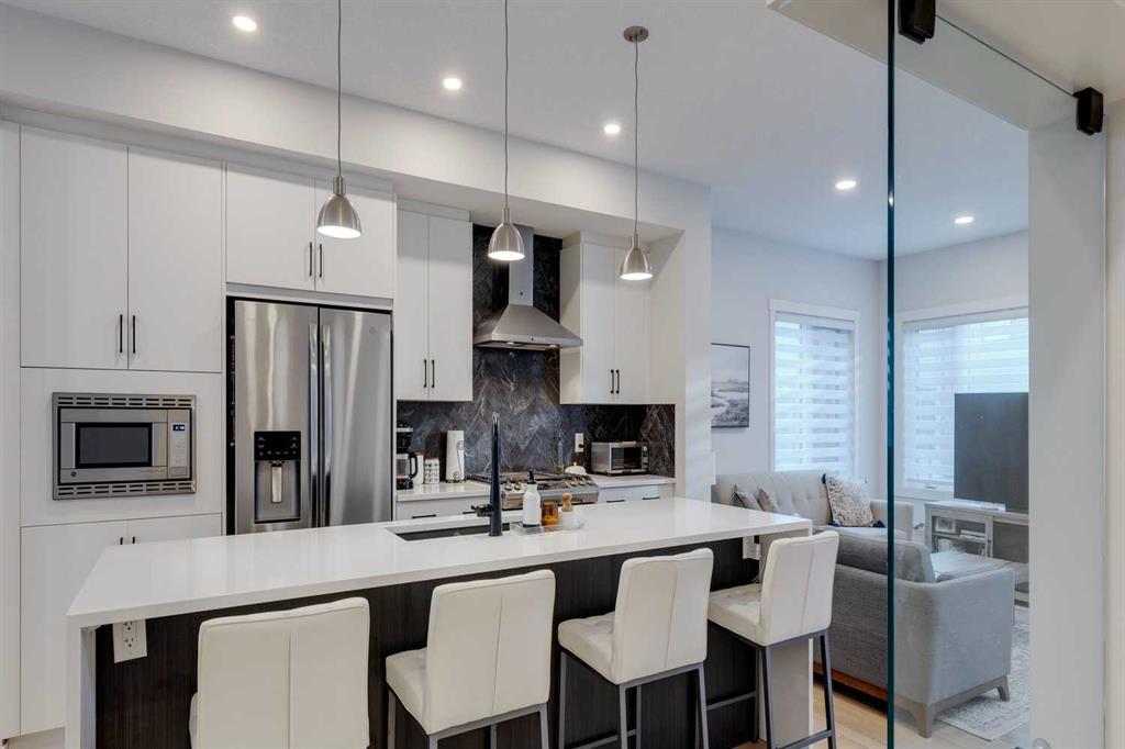 Step into our bright foyer opening to a versatile den, ideal for a home office, and access to the attached oversize single garage. The second level features a chic powder room, a conveniently located laundry room with a full-sized stackable washer/dryer, and shelving. The upgraded modern kitchen showcases a double waterfall quartz island, gas stove, built-in microwave, and pantry. Enjoy a sense of spaciousness with 9 ft ceilings, 8 ft doors, and glass partitions for added light. The third floor offers three bedrooms, a 4-piece bath, and a linen closet. The primary bedroom boasts blackout blinds, a walk-in closet with organizers/drawers, and a 4-piece ensuite with double vanity. As an end unit facing South, the residence benefits from ample natural light. Additional features include TRIPLE-PANE windows, CENTRAL AIR conditioning, and matte black fixtures. This new Greenwich development is gaining popularity, offering amenities like a playground, walking trails, and a dog park. Conveniently located near the Calgary Farmers Market, boutique shopping, restaurants, and coffee shops, with easy access to Foothills Hospital, Children’s Hospital, and the University of Calgary. A quick commute to downtown or the Rocky Mountains via 16th Ave NW/Hwy 1 complete the package!