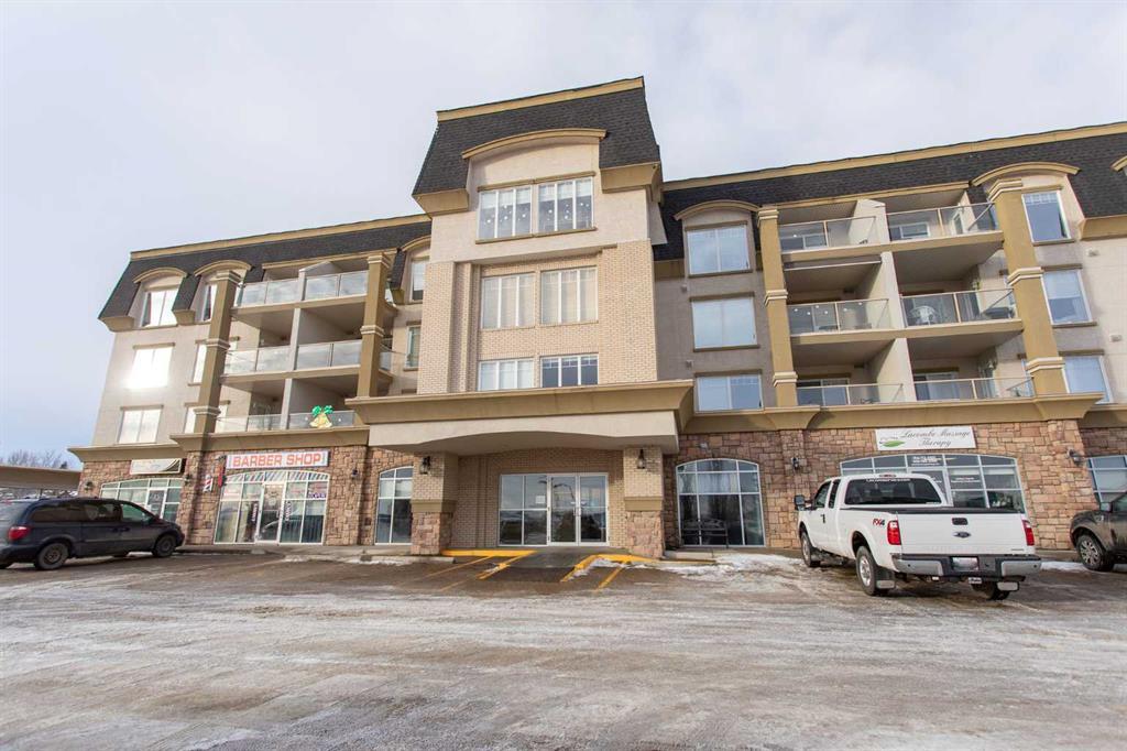 Looking to own a condo in one of Lacombe's finest adult living condo projects? Chateau Lacombe is centrally located within walking distance to downtown, shopping and the walking trails. This beautiful 2nd floor unit has east exposure with lovely views of the countryside! New flooring, paint and blinds within the past year makes this unit one of the nicest units in the project and shows exceptionally well! From the moment you enter the building you will be impressed with the design, spiral staircase and the overall cleanliness of the building. Up to the second floor - accessible by elevator or a short walk up the spiral staircase and you will arrive at your condo! Open the door and enjoy the sunshine that shines in, the open concept plan with lots of living space. Lovely kitchen boasting a large island, lots of cabinetry and countertop space, newer refrigerator, stove, and dishwasher. Ample room for the dining room table and china cabinet. Living room boasts lots of windows and garden door leading to the deck. Primary bedroom is spacious and features a walk thru closet and 3 piece ensuite. Second bedroom, 4 piece bathroom plus laundry/storage room complete the floorplan. This condo has a titled underground parking stall and assigned storage unit. Lots of parking out front for visitors, a common party room that is available to rent or to meet with your fellow residents for a game of cards, coffee or to work on puzzles. Get ready to eliminate snow shoveling in the winter and yard work in the summer and move into a condo! A friendly adult living community within close proximity to amenities!