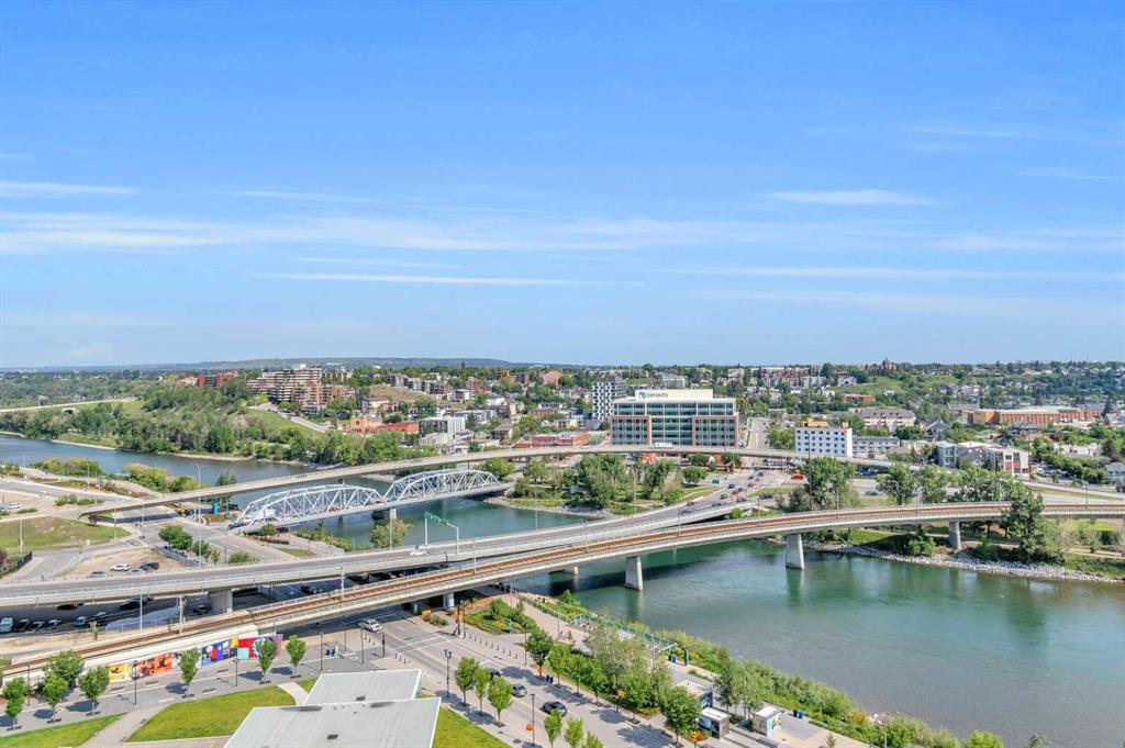 TITLED Underground PARKING, AIR CONDITIONED and Pet-friendly under 20lbs. One of the highest Studio suites, the prime location on the 12th floor near the beautiful Bow River make this suite desirable to both Residents and Investors. Rare for this size unit, the Titled parking is perfect for the business person interested in a hotel alternative to build equity, a first-time buyer or downsizers. East Village is a vibrant community in the heart of Calgary and this suite offers stunning panorama views of the River, Fort Calgary and Saddledome fireworks. A unique urban living experience is provided with this vibrant yet serene location known as a hub for arts, cultural amenities and entertainment with National Music Centre, Riverfront pathways, modern architecture blending seamlessly with historical buildings and convenient access to essential services, boutiques, a lively food scene, cafes, Dog Park, transit and grocery store. The excellent building amenities include a roof top patio, FITNESS and YOGA rooms, conference room, LOUNGE/games area, BIKE storage, courtyard and offers knock-out views of the River, Calgary Tower and area. The suite itself features upscale HE laundry, stainless steel appliances, QUARTZ counters/island, luxury vinyl plank flooring, undercabinet lighting and 4 pc bath with full tile-to-ceiling shower. This studio offers Titled underground parking near the elevator, 4x6 secured storage locker, secured visitor parking and is ready to move in to. A pilot project is also underway for short-term rentals. Call to view today.