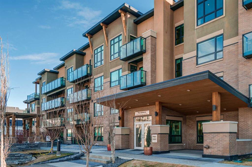 Welcome to the Armory! Seize the rare opportunity to own a main floor corner unit in one of the best adult-only complexes in the Currie Barracks! Previously showcased as the show suite, this residence boasts the largest floor-plan and prime location in the building, featuring numerous upgrades.This spacious 2-bedroom + den layout offers serene views of the quiet green area, sharing only one common wall with another unit. A distinctive feature is the hardwood flooring that spans throughout, setting this unit apart from others. The interior finishes are of exceptional quality, with 9-foot ceilings providing an open atmosphere and massive windows allowing natural light to flood the space. The thoughtfully laid-out kitchen comes with an upgraded appliance package, offering ample counter space, full-height cabinetry, a central island, quartz counters, and an abundance of storage. The adjacent living room, complete with a gas fireplace, creates a cozy space to unwind, with oversized windows framing tranquil views. The dining room, encased in windows, exudes casual elegance and provides plenty of room for entertaining. The primary bedroom boasts walk-through closets leading to an ensuite with a makeup counter, upgraded floor tiles, and an oversized shower. The second bedroom, located on the opposite side of the unit, is connected to a 4-piece bathroom and den offering a quiet space for a home office. Step onto the private patio complete with gas line to relax and enjoy your morning coffee or an evening BBQ. The unit comes with secured underground parking, additional storage, and bike storage. Situated in the historic community of Currie Barracks, The Armory offers a central location with nearby restaurants, walking paths, parks, and green spaces, all within a 10-minute commute to downtown. This premium unit checks all the boxes, inviting you to see for yourself and truly appreciate this gem!