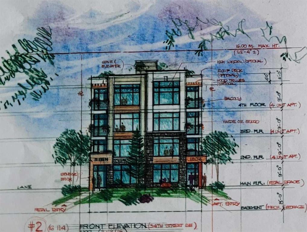 This property is a developer's dream, boasting three-sided lane access that is ideal for future construction. Envision a 4-storey multi-family mixed-use building, complete with 16 covered surface parking stalls (no need for expensive underground parkade), 18 modern apartment units, and 2 high-traffic retail spaces, capitalizing on the area's growth and demand with superb revenue potential.