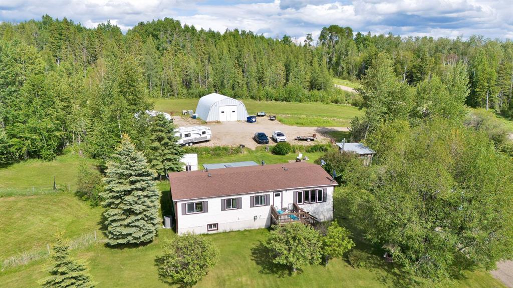Affordable acreage just 10 minutes north of Rocky with a beautiful mountain view. Modular home on a full concrete basement is in a great condition with many recent upgrades. Open kitchen and dining area was fully renovated in 2018 with new cabinets, countertops, appliances and flooring. Big west facing window in the living room to enjoy the view. 3 bedrooms on the main floor including the primary with an updated ensuite and new shower last year, and a 4 piece main bathroom. Full concrete basement is partially finished with 1 bedroom, family room with a pellet stove, gym area, 3 piece bathroom and great storage. New furnace in 2015, central air in 2022 and pressure tank and water lines in 2023. The roof was re-sheeted and shingled in 2014 and the home had all new windows and exterior doors installed in 2020. The rear of the property was cleared in 2017 to make room for a large gravel pad and the construction of a new 35x46' shop. Shop is fully finished, heated with overhead radiant heat, an exhaust fan, a 12' overhead door, 220 power and a floor drain. There's plenty of parking space, shelving and work benches plus a great hot tub in the corner to unwind after a busy day. A few additional sheds in the yard plus an older double detached garage for more cold storage. The property is nicely landscaped with mature trees and a big mountain view to the west.
