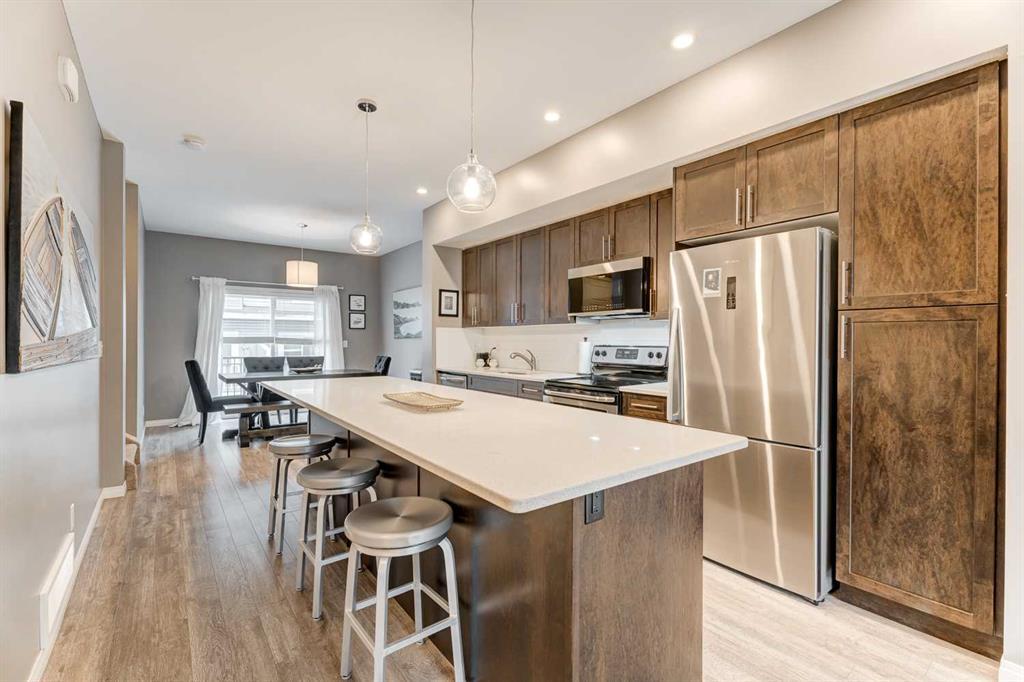 Welcome to this beautifully upgraded executive-style townhouse, which offers 1462 square feet and a 40' extended garage. When you step into the main living level, you will be impressed with the soaring 9' ceilings, which create an inviting and airy atmosphere. Stylish laminate flooring spans the space, adding to the modern and low-maintenance appeal of the home. The open-concept living room, kitchen, and dining room are designed for optimal functionality and are perfect for hosting and entertaining guests. The living room features attractive built-in shelves and a sleek electric fireplace. Did I mention plenty of room for an oversized, comfy couch? The kitchen boasts a vast white quartz island, beautiful dark cabinetry, and stainless steel appliances. The dining room offers ample space for hosting guests and enjoying meals together. Completing this floor is a powder room. Head upstairs, you'll be welcomed by two generously sized bedrooms. The primary bedroom offers an expansive space for a king-size bedroom suite. It has an ensuite bathroom featuring tile floors, double sinks with a quartz counter, a standalone shower, and a walk-in closet. The second bedroom is perfect for a roommate or living with a friend or as a spacious kids' bedroom. Additionally, you'll find a 4-piece bathroom and convenient upstairs laundry to round off this floor. Moving to the lower level, the garage is a hobbyist's dream space, spanning an impressive 40 feet long and featuring lots of built-ins. The garage provides indoor storage for your vehicles, tinkering around with your toys, or it could be an excellent space for a home gym. A man-door leads out to the driveway, which is also long enough to park a truck. This stunning property is located in a quiet, well-managed complex, conveniently located close to shops and restaurants. It offers quick access in and out of Airdrie, adding to the appeal of its location. Come check it out for yourself; you won't be disappointed!