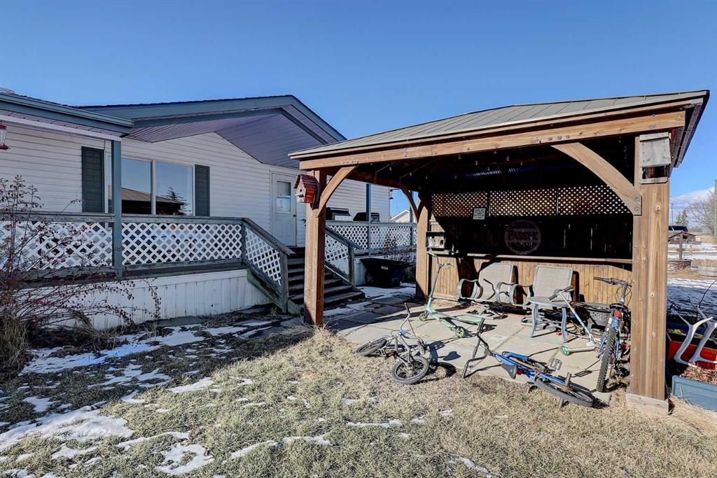 WHAT A PROPERTY! 2001 manufactured home on it's OWN LOT with a attached 1200 SQFT In-floor HEATED GARAGE located on a corner lot in the town of Bezanson (19 miles east of Grande Prairie). The home features 3 generous bedrooms and 2 full bath rooms. The Kitchen is loaded with cabinets and an eating bar that is open to the dining and living room. The other great feature about this property is the designated laundry/utility room that then give you direct access to the heated garage! The garage is truly the TREAT of this property if you are looking for a home with a large garage and a great place to hang the coveralls at the end of the day....and take advantage of the CHEAP COUNTY TAXES....($1800 a year)…This is a fabulous option! Notable features - Cheap taxes, corner lot, loads of parking, gazebo, in floor heat in garage, wheelchair friendly and move in ready!