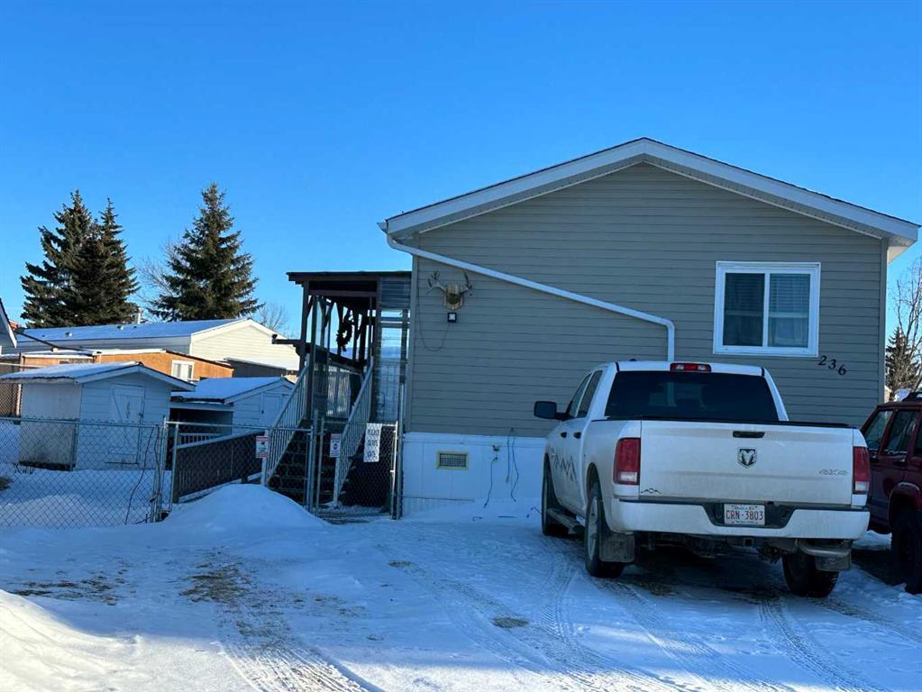 Situated in Benalto, Alberta, this double-wide mobile home offers practical living with its 1520 square feet of space. Featuring vaulted ceilings in the main living area, the home provides a cozy atmosphere. The exterior has a covered front deck with a wheelchair ramp for accessibility and fully chain link fenced yard. Inside, there are three bedrooms, including a primary bedroom with a generous four-piece bathroom and a spacious walk-in closet. The open floor plan seamlessly integrates the kitchen, dining, and living room areas, promoting easy interaction and functionality. Additionally, there's a second four-piece bathroom, a separate laundry room, and a large foyer. Practical laminate flooring spans the living spaces, while the kitchen comes equipped with essential appliances such as a fridge, stove, microwave, and new Bosch dishwasher. For additional storage, the property includes two sheds, providing ample space for outdoor equipment and other belongings. Monthly lot rent is $504 which includes water, sewer, and garbage. Park approval is required for owners and pets.