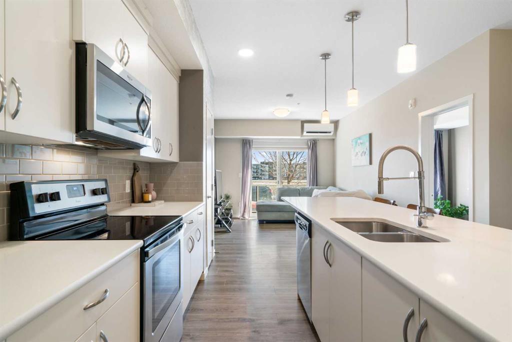Welcome to luxury living at its finest in this immaculate 2 bedroom, 2 bathroom main floor condo nestled in the desirable community of Seton. Boasting a south-facing orientation, this 825 sqft unit is flooded with natural light, creating an inviting ambiance from the moment you step inside. Step into the heart of the home where a beautifully appointed kitchen awaits, featuring floor-to-ceiling white cabinets, sleek quartz countertops, and a spacious island with peninsula seating, perfect for casual dining or entertaining guests. The primary bedroom is a true retreat, complete with an ensuite bathroom featuring dual sinks, a spacious shower, and a walk-in closet for added convenience and storage. A second generously sized bedroom offers flexibility for use as a home office or guest room, serviced by a well-appointed guest bathroom. This condo also offers in-suite storage and laundry facilities for added convenience. Additionally, included with the unit is a titled underground parking stall, providing secure and hassle-free parking year-round. Conveniently located within close proximity to a host of amenities, including shopping, dining, entertainment, and recreational facilities, this condo offers the perfect blend of comfort, convenience, and style. With easy access to major transportation routes, commuting around the city is a breeze. Don't miss out on the opportunity to make this stunning condo your new home. Schedule your private showing today!