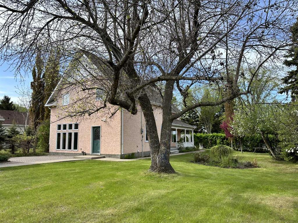 PRICE REDUCED!! Stroll into the private 17,500 sq ft landscaped paradise. Grab a cup of coffee and unwind on the wraparound terrace or the back deck. 2 garages- single & double detached offer plenty of parking & a potter’s shed enhances the appeal. The kitchen is the heart of this open concept home featuring beautiful white custom-built cabinetry, granite countertops and a large breakfast bar. Large windows, high ceilings and hardwood flooring throughout the main floor adds lots of natural light and makes a striking statement to any visitors. Featuring four bedrooms on the 2nd floor, the primary bedroom boosts a full wall of custom-built cabinetry for ample storage. Complete with a 3-piece modern ensuite, it is the perfect hideaway. The upgraded main bathroom is incredible with a soaking tub and large walk-in shower finished with white crisp subway tile. The ideal location this home is situated on a private corner lot in a mature quiet neighbourhood two blocks from downtown and two blocks from school. Upgraded plumbing, new hot water tank, new boiler (2024). Maintenance-free flooring on the wrap-around terrace. Originally built in 1925. Major addition and upgrade enhanced the home in 1996 The perfect combination of character and modern touches, this property needs to be seen to be appreciated.