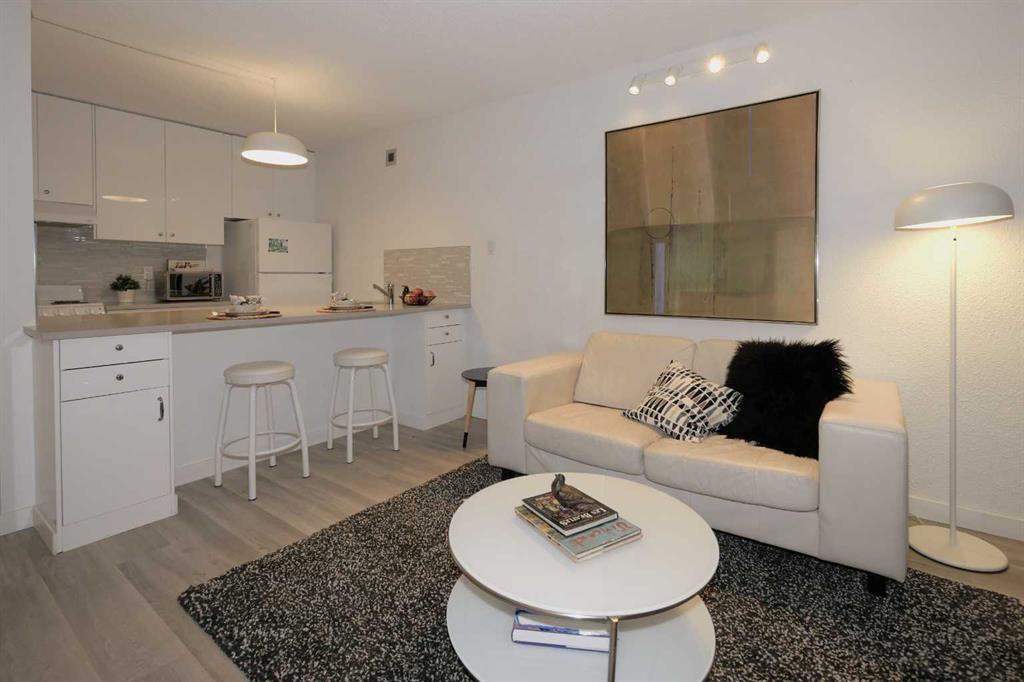 This bright and spacious inner city 10th floor Scandinavian-style studio apartment has lots of storage and a beautiful aesthetic. The unit boasts tall ceilings and a wall of floor to ceiling windows which feature quality room darkening window treatments, and an extra-large 15 x 8-foot balcony. Additional enhancements include luxury vinyl plank flooring, fresh paint throughout, white cabinets, quartz counters, and custom closets with built-in drawers, including a spacious walk-in closet. The building offers a common laundry room on every floor and the condo fees of $404.33 includes heat, water and sewer. The location is superb with unmatched walkability, just steps away from the CTrain station within the free fair zone, shopping, many pubs and eateries, theatres and the river pathways. An easy walk to Olympic Plaza, City Hall, Bow Valley College, Prince’s Island, the Calgary Public Library, Studio Bell, Theatre Calgary... the list goes on! And there's PLUS-15 access, so you don't need to go outside on those cold winter days! This is a well-run complex with on-site management and evening security. As a resident of this building, you’ll also have access to a fitness room, sauna, squash/basketball court and a large 4th floor patio which is a great spot for relaxing, socializing and for viewing the Stampede Parade and fireworks. The Rocky Mountain Court Social Club meets monthly in the lobby of the building. This beautiful studio unit is a perfect opportunity for an investor or a first-time buyer looking to be in the heart of downtown Calgary at an affordable price point. Don't miss your chance to check this one out!
