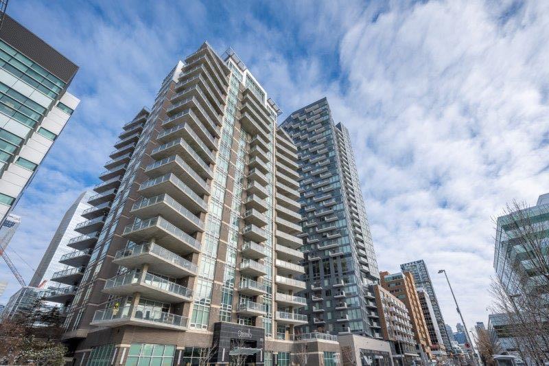 Welcome to your new residence in Castello situated in the heart of Downtown (Calgary design district) This suite is where unique sophistication meets convenience, you’ll be able to enjoy the close proximity to all the numerous amenities and services, including bikes lanes directly out front of building, C-train access, gyms, restaurants, Core shopping centre, 17th ave are just steps outside your front door for the ultimate urban lifestyle. This beautiful 3rd floor 1041 SqFt north facing suite has two large bedrooms, two full bathrooms, built in desk area and large balcony. This suite is equipped with sleek modern finishes with an open concept, quartz counters, plenty of cabinet space, stainless steel appliances, dishwasher and microwave/hood vent combo. Suite is wired for sound with ceiling speakers, bedrooms have large closets with blackout blinds. Primary bathroom is appointed with large walk-in with shower, second bathroom has large soaker tub. Full size in-suite washer & dryer, floor-to-ceiling windows, new laminate flooring and central air conditioning completes an awesome property to call home. Take advantage of the amenities Castello has to offer including a well appointed gym, bike storage and visitor parking available. Titled secure underground heated parking stall and tilted storage locker. This is a perfect property for the individual looking for an inner city condo.