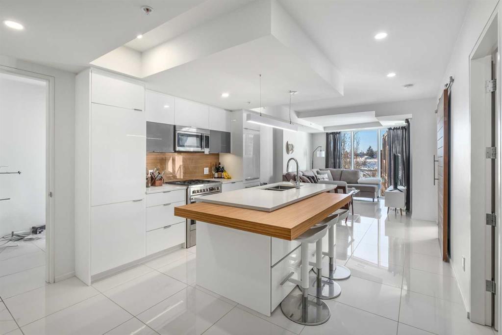 Welcome to this sleek and modern 2 bedroom, 1 bath condo in the highly sought after community of Inglewood. Ideal location next to East Village, the new Arena Rivers District, the Greenline LRT station, 2 rivers and four river front parks. Calgary’s oldest and most iconic neighbourhood. One block from the Bow River with pathways and parks. This unit boasts the finest in contemporary custom made cabinetry. Stylish gourmet kitchens offer ultra-modern flat panel doors in a white high-gloss overlay finish with metallic edging. Complementing the cutting-edge European design, sleek minimalist chrome hardware, soft-close drawers, flip-up doors, built-in pantries, integrated refrigerators, and quartz countertops are all standard. Large balconies and terraces with stunning views, concrete building, art inspired architecture, library, meeting space & book exchange amenity located on the second floor, guest suite for the personal and private use of all owners, third floor, professionally landscaped, rooftop outdoor garden terrace equipped with BBQ’s and patio furniture, secure underground heated parking, high speed internet delivered through fibre network, solid core barn doors, Patio natural gas heater rough in. Professionally managed building with affordable monthly condo fees. Security cameras and entry fobs for all access points as well as fire protection envelope in each home with integrated sprinkler system in every room and smoke detectors for ultimate piece of mind. This condo is a must see!