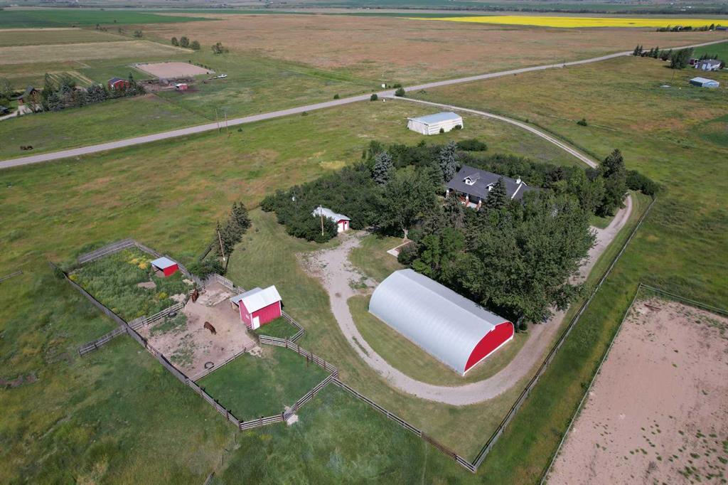 All paved access, except for the laneway!!!! An absolutely stunning 22.21 acres with custom-built Lask Home with oversized double attached garage, located SW of High River. Paved and hard top access right to the driveway from High River and Calgary!!!! IMMACULATE property that is perfectly set up for horses with 4-stall barn, outdoor riding arena, corrals, stock waterer and lots of room to roam. Additional storage options with a Quonset and smaller storage sheds. The beautiful 1687 sq. ft. bungalow home boasts comfort throughout and has open concept with vaulted ceiling on the main floor. The open kitchen has exquisite hickory cabinets with quartz counter tops and the island and is set up to be the hub of the home. Dining room is large and is spacious enough for those special occasions for extra guests at the table! Primary bedroom is big with a large 5 piece ensuite, The 2nd bedroom on the main level is spacious and bright. The basement has a massive family room and two bedrooms all with 9' ceiling, walk-in closets - lots of room for that growing family. There is enough room for another bedroom if that is what you need! In-floor heating in the lower level provides all the comforts on this level. The south facing front entry/deck is the length of the home and low maintenance with composite plank flooring - a great spot to sit, relax and enjoy your favourite beverage. This beautiful Home is nestled around a mature shelter belt, with trees and shrubs which provides the privacy you require. If you enjoy gardening, a large garden area and raised garden beds will be perfect for fresh vegetables and fruits! Approximately 15 acres of pasture for horses or the stock that you choose. Recent water well report for the house shows 11 gpm!!!! We haven't mentioned the enormous views!!! You will absolutely enjoy the green foothills and mountain views from this spectacular property! Attached garage is 25' x 29'5, Quonset 1 is 40' x 60', Quonset 2 is 40' x 64', Storage Shed is 17' x 12'6", Shelter is 17' x 11', The photos included do not show the picturesque beauty. With all the recent moisture we have received, just imagine the lush green foothills that lead up to the snow covered mountains and BLUE SKIES. View this one today!!!