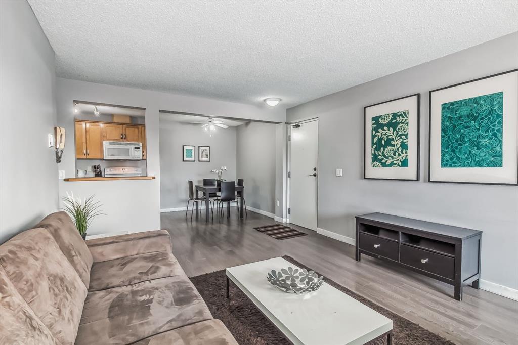 2nd floor sun lit South facing second floor unit (sorry, no elevator). This renovated unit has views South towards Fish Creek park has the ultimate privacy in the complex, looking onto neighbouring homes (no one looking right in your window). Continuous hard floors throughout this home tastefully accent the unit that has been modernized. From the entry you look over the large living room, the dining room adjoins the galley kitchen, with fridge, stove, dishwasher and microwave hood-fan. Both bedrooms are large, the primary bedroom has room for a king bed, two night stands and a dresser, not to mention having your own walk-in closet. The second bedroom can fit a queen bed and night stand. The bathroom has been renovated with updated tile and vanity. This home offers in-suite laundry. Drive right in to the heated underground parking and keep you car warm all winter long. There is a storage locker near your parking for your extra personal belongings, skis, boxes, winter tires, etc. Steps to Fishcreek Pathways, parks and local shopping. The complex has a party room and exercise room.