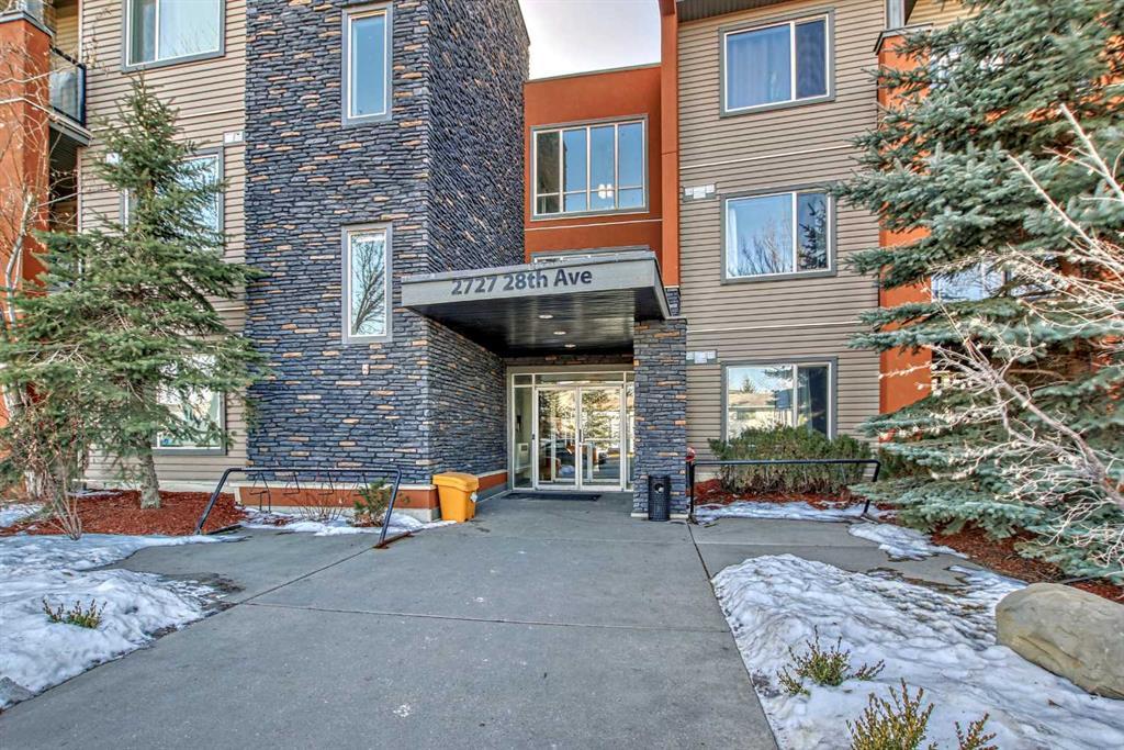 Beautiful one bedroom condo built by Jayman. Steps to one of the nicest ridges in Calgary with incredible views of the Rockies and downtown Calgary! Shows like new and shines with upgrades. Almost 9 foot ceilings, big windows and the patio doors bring in loads of natural light. The kitchen has espresso coloured kitchen cabinets, black quartz countertops and SS appliances. The breakfast bar is huge and acts like a 4 person kitchen table. The main living area has warm cork flooring & updated paint. Off the kitchen there is a builtin desk & shelving unit~ great for the home office. There is a pantry in the kitchen and a coat closet at the front door. The main bathroom is oversized as it contains not only the 4 pce bath but the stacker washer/dryer as well. The Master bedroom is large and has a good sized walkin closet. From the Master you can actually see Calgarys skyline! Off the living room there are sliding glass doors that go out to a good sized covered patio~ great for relaxing after work and the summer BBQ's. Serene setting for a condo complex~ just off the ridge and backing onto a huge greenspace. The back courtyard is awesome for entertaining. Easy walk to Valleyview Park which has a splash park for the kids, a large volleyball area, picnic tables & playground. There are miles of walking paths which run parallel to the ridge so you get full views of the Rockies/downtown the entire time. Underground heated parking is titled (#181) plus there is a storage cage at the back of the stall as well. The bike storage is handy and included in your condo fees which are reasonable at $343 a month. There are solar panels on the roof which are to help offset the overall electrical load here. Board approval for pets~ 1 dog or cat with a weight restriction as well