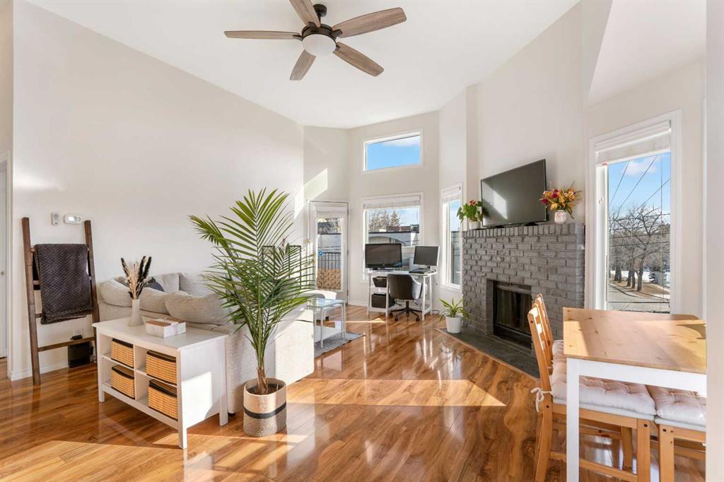 Prepare to immerse yourself in the vibrant downtown atmosphere like never before, just moments away from the bustling energy of 17th Ave – home to the trendiest shops, bars, and eateries in town. This exceptional residence has undergone a comprehensive makeover, boasting brand-new kitchen tile, blinds, newly installed staircase leading up to the apartment, new roof, and siding that seamlessly elevates its curb appeal. The space is adorned with Luxury Vinyl Plank flooring, designed to withstand your furry companions without sacrificing style. As you enter the living room, prepare to be awestruck by the soaring 14-foot ceilings, complemented by a magnificent wood-burning fireplace and bay windows that bathe the room in natural light. The master bedroom – with its lofty ceilings and clerestory windows, creating an ambiance of spaciousness and luminosity throughout the day. The kitchen is a vision of modern elegance, featuring a sleek design, ample storage, a convenient breakfast bar, and newly tiled flooring. Plus, there's even space for a cozy workstation, perfect for multitasking or enjoying your morning coffee. Convenience meets functionality with in-suite laundry discreetly nestled within a generous storage area adjacent to the kitchen, ensuring a clutter-free living environment. Step outside onto your private balcony – a serene retreat where you can unwind and entertain amidst the backdrop of city views. And the perks don't end there – this unit comes complete two underground "heated" assigned parking spots for your ultimate comfort and convenience. This property is pet-friendly and conveniently located near a dog park. With excellent transit options within arm's reach, you'll enjoy seamless connectivity to all that the city has to offer. Don't miss out on the opportunity to experience urban living at its finest – schedule your viewing today and make this your new home sweet home.