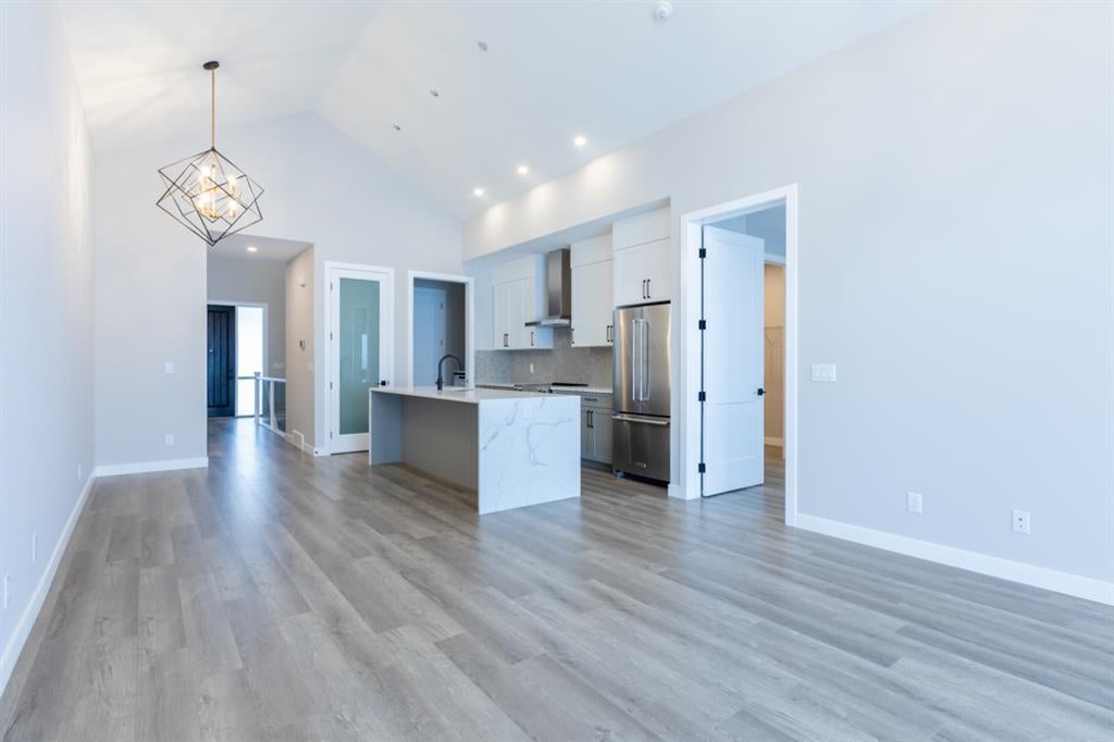 Prepare to be impressed by this contemporary, villa style townhome with a fully finished walk-out basement. The dramatic, soaring ceilings are undeniably the most notable characteristic of the home when you first enter. Inside you'll find a stunning kitchen with full-height cabinets, a functional pantry, upgraded appliances, quartz countertops, a gorgeous backsplash and a modern, waterfall island. Simply put, a chef's delight and perfect for entertaining! The kitchen opens up to a large dining area and its adjacent, bright living room. This space's most prominent attribute is the windows; they span the entirety of the wall and double as sliding doors that exit onto the balcony. You can enjoy the spectacular, unobstructed view this level has to offer. Lastly, on the main floor is the elegantly appointed owner's suite. This room is highlighted by its luxurious ensuite with a barrier-free walk-in shower and double vanity. Descend to the lower walk-out level where you'll find a massive rec area leading onto a cozy patio. Adjoining is the flex room; its convenience is in its versatility. An additional bedroom with a large window, walk-in closet and a 4pce bathroom complete this level. This spectacular property will appeal to a buyer who appreciates upgrades, some of which include: stylish black lighting, an upgraded trim package, a dual-zone thermostat, and laminate and tile flooring throughout both levels. Whether you and your family are looking to discover more of Alberta's natural land or are already seasoned mountaineers, Crestmont is irrefutably the community for you. This exclusive southwest neighbourhood is not only a quick exit to the mountains but is also conveniently located close to Calgary Farmer's market, C.O.P., Calaway Park, and a variety of parks and walkways.