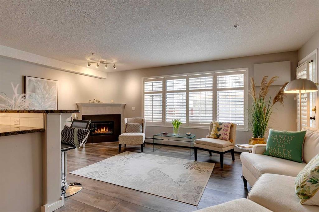 was pending with multiple offers - back to active due to lack of performance. Nows your chance! This suite should be a showhome! One of the best renovations in the building! Absolutely stunning one of a kind one bedroom plus den in a building where listings don't last long. Gorgeous open concept with full natural light. High end finishings, stainless steel appliances, granite counter tops, ceramic tiles, laminate wood flooring and hunter douglas blinds. Over $150,000 in gorgeous renovations. Enjoy sitting in front of your crystal stone gas fireplace and looking out to a beautiful green space through the large living room windows. . $20,000 in built in designer closets for bedroom and hallway that must be seen to be appreciated. Well designed laundry room provides ample space and storage. The patio is your own private sanctuary. Backing onto a green space and walking paths with birds and bunnies and just the right amount of sunshine and shade. This is a stunning home with plenty of space for entertaining or just quiet enjoyment. Add in main floor access with heated pool, hot tub, gym, billiards room, games room, arts and crafts room, library, lobby sitting area with fireplace, community event hall, gazebo, underground parking, car wash bay, storage and ample free visitor parking, and you just can not miss this opportunity. This 40+ building comes with an active social committee that organizes happy hours, coffee chats, pot lucks, dances and more. Never need to feel alone. Fabulous guest suites available for friends and family to visit! This building has it all. Underground heated parking stall with extra storage room right in front of your spot. Home can even come fully furnished! ***Offers being reviewed Sunday by 6pm****