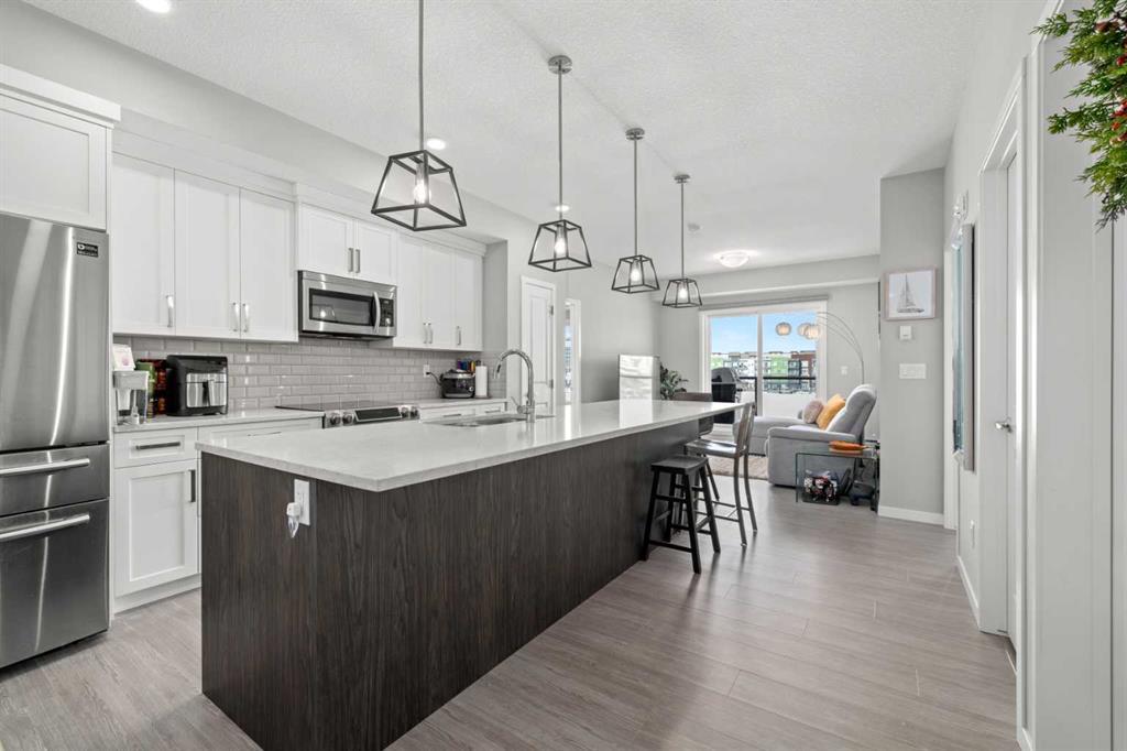 Discover this charming home in Seton, nestled within a vibrant community mere minutes from the esteemed South Health Campus. Enjoy expansive views of the serene City of Calgary Park. This residence offers an unparalleled living experience with 2 bedrooms and 2 bathrooms. Inside, you’ll find a spacious eat-in kitchen dining area adorned with luxury vinyl plank flooring that seamlessly flows throughout. The open-plan main area features a stunning white kitchen with stainless appliances, quartz countertops, and contemporary lighting. An extended island adds both functionality and style. The primary bedroom is a retreat, complete with ample space, a four-piece ensuite featuring double sinks, and a generously sized walk-in closet. On the opposite side of the unit, the second bedroom ensures privacy and is conveniently located near a four-piece bathroom. Practicality meets convenience with a well-appointed laundry room just off the kitchen, offering additional storage space. The residence includes a titled underground parking stall and a storage locker. This location is unmatched, providing effortless access to the new YMCA, movie theaters, various grocery stores, and a plethora of dining options. With great connectivity to Deerfoot and Stoney Trails, commuting to downtown is a breeze. Indulge in a lifestyle where meticulous maintenance meets sophisticated living.