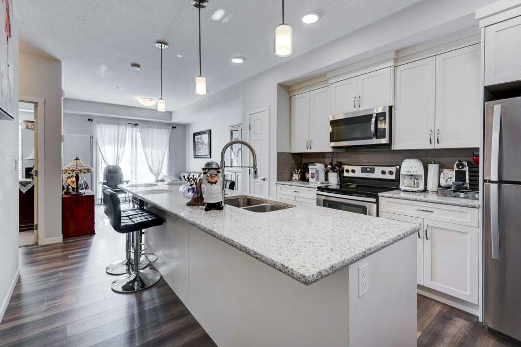 Welcome to this cozy one bedroom condo in Seton. This south facing unit has functional layout, titled underground parking, park and mountain view from the balcony. The unit features quartz counters, island with dining bar, 9 foot ceilings, stainless steel appliances, and pantry for storage. The unit also comes with in unit laundry/ storage room. Fantastic location, easy access to Stoney trail and Deerfoot, besides World largest YMCA and public library, Walking distance to Calgary south health campus.