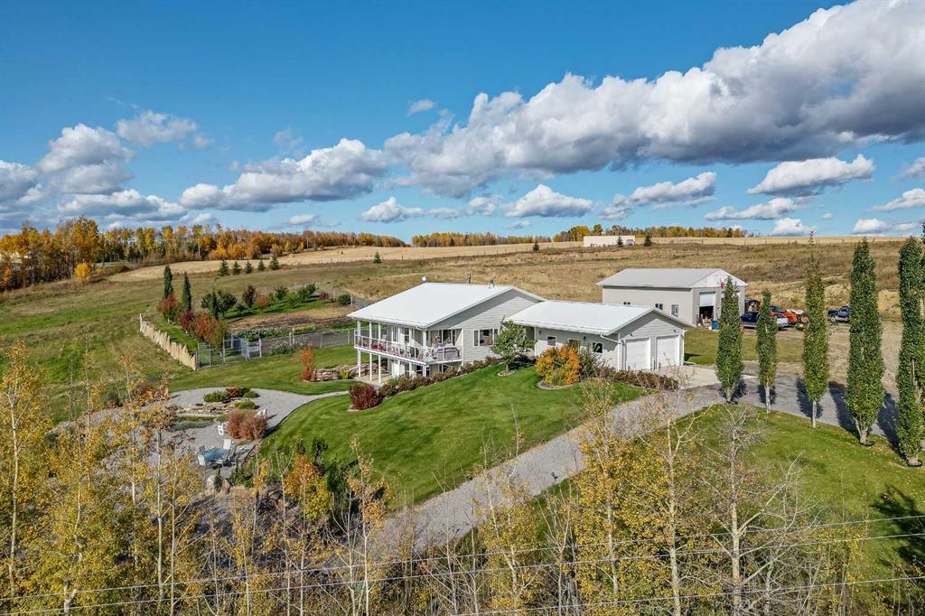 Serene Acreage with Breathtaking Views and a Fully Finished Walk-out Bungalow! Nestled on just over 7 picturesque acres in the rolling foothills just northwest of Leslieville, this property is a nature lover's dream. With magnificent views of the Rocky Mountains and a range of exceptional features, this 1952 sq ft fully finished walkout bungalow built in 2007 is a true gem! This fine home is in impeccable condition, with an open concept living area, high-efficiency wood-burning fireplace, and separate formal dining area. The kitchen boasts granite countertops, a walk-in pantry, stainless steel appliances, a gas stove, double ovens, quality oak cabinetry, and hardwood floors. The massive master bedroom features a 5-piece ensuite with an air tub, a walk-in closet, and a heated tile floor. There is also an additional main floor bedroom and a main floor office for convenience. The lower level is finished with a large rec room, big windows, and three more bedrooms, bringing the total to 5 bedrooms. The home offers dedicated storage space and a wood-burning stove to keep you warm and cozy. The wide and open spaces are designed with accessibility in mind and its Elevator Ready! The large upper and lower closets are designed to accommodate an elevator if the future need arises. Cement board siding and a metal roof, ensure durability and longevity.There's a covered breezeway at the front entrance, adding to the home's welcoming character. A 24x30 attached garage offers convenience and shelter for your vehicles plus a 32x42 shop is perfect for hobbies and storage, providing ample space for your projects and equipment. This property offers a unique blend of natural beauty, modern comfort, and thoughtful design. The gardener in the family will love the large garden and the chain link fencing will keep the hungry deer out! A custom rock retaining wall, dual ponds and a firepit area are perfect spaces to enjoy the outdoors. The high production well was last measured at 30 gpm. Whether you're looking for a tranquil retreat or a space to indulge your hobbies, this is the perfect place to call home, and a great opportunity to make this extraordinary property yours!