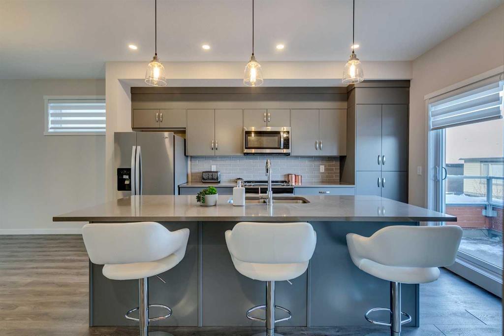 EXCITING NEW PRICE | STUNNING 2018 3-BEDROOM TOWNHOUSE | ATTACHED DOUBLE TANDEM GARAGE + DRIVEWAY | 4-MIN DRIVE TO FISH CREEK PARK | END UNIT | GORGEOUS VIEW FROM PRIMARY BEDROOM | 13-MIN WALK TO C-TRAIN STATION | Welcome to Fish Creek Exchange, located in Shawnee Slopes (a new neighbourhood in an established community) and just a 3-minute drive to the C-Train station, steps to an off-leash dog park & playground, minutes to public tennis courts, and close to an abundance of amenities plus a lot more amenities COMING SOON! If you don't want to live in the far south end of the city, but still want a newer home, then this is an amazing opportunity! This stylish 3-storey townhouse features parking for 3 vehicles - an attached double tandem garage with extra storage area at the back, plus a driveway out front and visitor parking just a few houses away. Built in 2018, this luxurious home features everything you would expect in a new property: 9' ceilings, high-end double roller shade blinds throughout the main floor (black-out shades in the bedrooms), air conditioning, luxury vinyl plank flooring everywhere except the bedroom level, ensuite bathroom, and lots of storage space. On the main floor, you will find a large foyer, utility room with an abundance of storage space, and access to the attached garage which has a door leading out the back of the property to an EXTRA PATIO SPACE on the ground level. On the first floor up, you will find a half bathroom and open kitchen/dining room/living room. The gorgeous kitchen features QUARTZ counters, a large island with breakfast bar, stainless steel appliances, stylish brick-looking tile backsplash, soft-closing cupboards, and access to the balcony with room for BBQ'ing and enjoying the sunshine! The living room boasts a view of the park out the corner window. The top floor features 3 bedrooms, a small nook, laundry room, and 2 full bathrooms. The primary bedroom features an epic view over the houses behind, a modern ceiling fan, large closet, and beautiful ensuite bathroom with quartz counters, luxury vinyl plank flooring, and large shower with rain showerhead, body jets, and seat. One of the secondary bedrooms also features lovely corner windows because this home is an end unit - what a delight! Enjoy family activities in the park on-site and a free little library, as well as hot dog skate nights through the community association. Condo fees include water, sewer, garbage/recycling, maintenance of the grounds including landscaping (grass cutting) and snow removal, professional management, and reserve fund contributions. The remainder of the new home warranty will be transferred to the new owners on possession day.