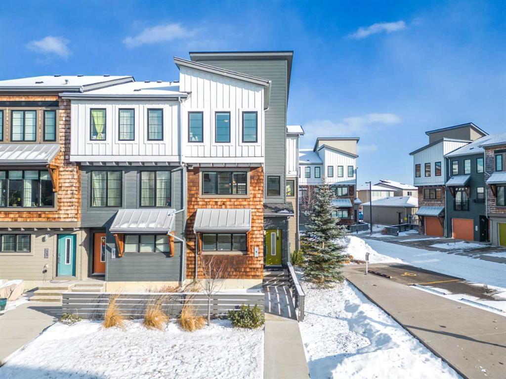 Welcome to this immaculate 3 story townhome, The Edison, built by Avi Homes. This great corner unit is flooded with natural light and features large windows throughout. Upon entering the lower front area, you will find a spacious flex room with a generous closet for storage. this room can serve as an office, gym, reading room, or extra TV room. the space is equipped with an electrical wall heater that warms it up very nicely. This main floor boosts 9 foot ceilings, a modern kitchen with an island, quartz countertops, a gas stove, pantry and an extra closet for storing the vacuum attachments, brooms, and more. Additionally , there is an electric fireplace in the cozy living room,, a 2-pc bathroom, a desk nook, and doors leading to a large balcony with ample furniture space and a gas barbecue hook up-perfect for summer evenings. The upper level offers 3 bedrooms, a 3 pc ensuite, an additional 4 pc bathroom, stacked washer and dryer. There is fully finished, heated (electrical wall heater) singe attached garage with water, an attached furnace room with ample storage space. There is additional parking in the driveway as well as visitor parking conveniently located nearby. Enjoy more sun on the southwest spacious concrete patio out front. This unit shows very well and is move-in ready. With great access to all shopping, park, Stoney trail ring road, the pathways of Fish Creek park and also Sikome Lake, this townhome offers great value. Don't miss out - schedule a viewing today!