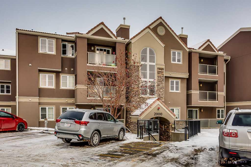 2021, 3400 Edenwold Heights NW | 2 Bed, 2 Bath Second Floor Condo | Large Bright Living Room With Corner Gas Fireplace & Access To A Private Covered South Facing Balcony | Open Concept | Kitchen With Eating Bar Overlooking Living Room & Dining Area | No interior pictures.