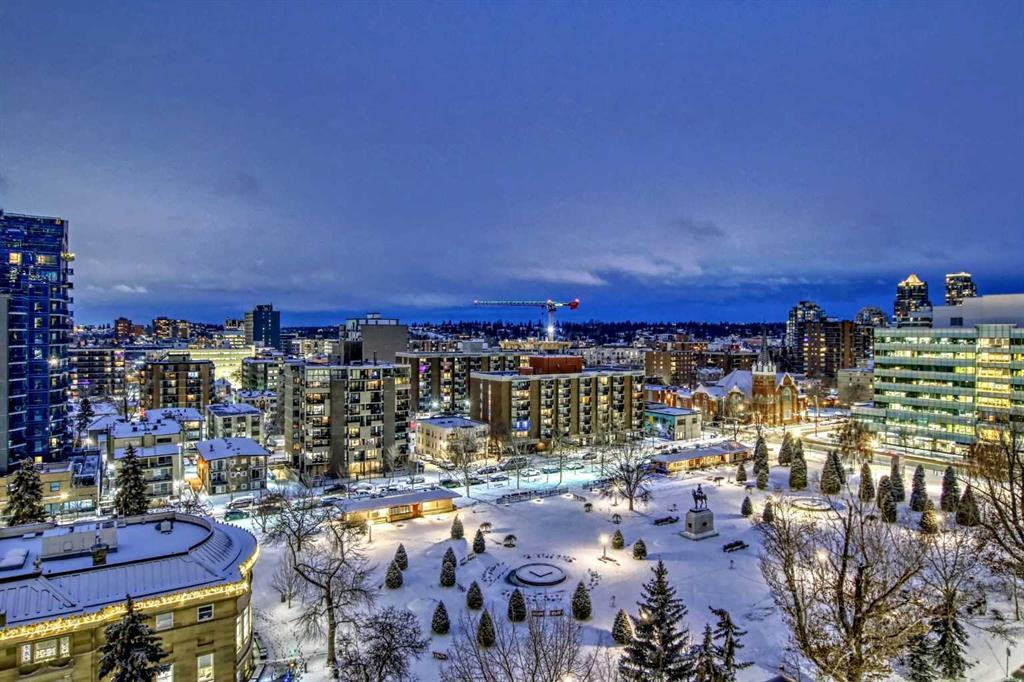 Situated in the historic Central Memorial Park, this condo lies at the core of Calgary's Beltline district—a welcoming and dynamic area highly coveted for its location. It stands within easy walking distance to everything, encapsulating the essence of urban living in downtown Calgary with its impressive building amenities and views of the park. The unit features two bedrooms, two bathrooms, and a den, designed with modern living in mind. Key highlights include genuine granite countertops and a full slab backsplash in the kitchen, alongside marble-topped vanities in the bathrooms. The open-concept design seamlessly integrates the kitchen's cabinetry, appliances, and hardware, creating a cohesive living, dining, and working environment. Residents will enjoy access to a variety of top-tier amenities, including a serene Zen Terrace, an outdoor social lounge, and well-equipped fitness areas.