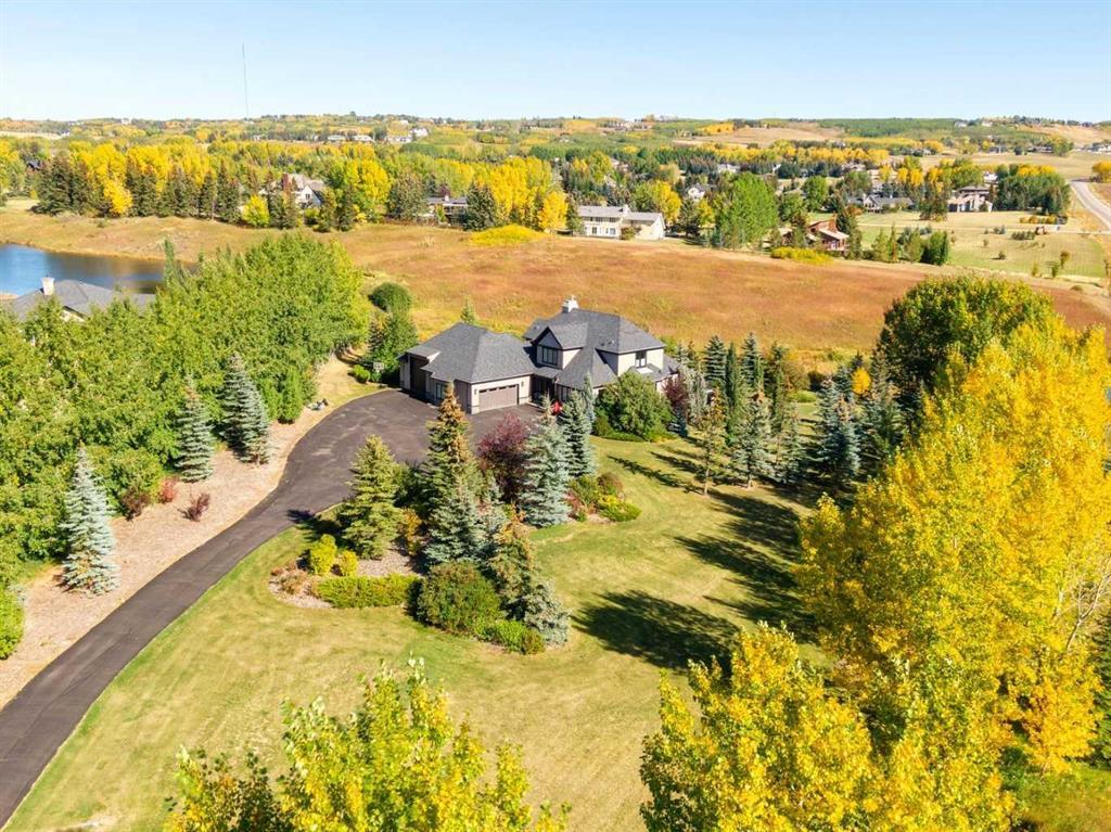 Welcome to Sterling Springs! This home offers over 5300 sft of comfortable and spacious living in the heart of Spring Bank. Priced to allow a family to enter this acreage lifestyle at a reasonable level. Situated on a 2.66 acre heavily treed lot, this home is perfect for all families. Backing on to a ravine and surrounded by wonderful landscaping, this home provides a private setting. This 1 ½ story home is very versatile. With the Primary bed on the main floor, one could easily grow with their family and eventually age in place. Additionally, one could have plenty of space for extended family. Every bedroom has its own bathroom, allowing for independent living for all to enjoy. Enter the custom front door to a large foyer, with the home office immediately to the side. Look through to the rear of the home and the expansive windows, to the Great room which comes with a two-story soaring roofline and a stone fireplace. Off to the left of the great room is a large dining room, that is wrapped in windows. Leading from there, is a huge chef’s kitchen spanning the side of the home, featuring a large island and custom-built cabinetry with lots of storage and counter space. Coupled with a large pantry, you have everything you may need to feed a family. You have access to your yard and large deck from the kitchen as well. It doesn’t stop there; the Primary bedroom is on the main floor; it is adjoined by a well-appointed double vanity sink spa like ensuite with its own generous walk-in closet. It is all conveniently accessible from the Great room. Further, the elegant staircase leads to the second floor where you will find a reading loft and two large bedrooms. Each bedroom has a bathroom and plenty of closet space. Tucked into the roofline, this allows for interesting character to these spaces. If that is not enough, how about a fully developed basement featuring an inviting wet bar overlooking a games table and large rec room. Leading to an expansive walk out and covered pressed concrete patio. Ideal for the kids and entertaining. Want to cozy up and watch your favorite movie? Well, your own theatre and projector will provide that for you. Don’t want to go to the gym? Well, this home has its own, no excuses! If you need a guest room or an in-law space, this home has an additional bedroom in the basement as well. Coupled with in floor heating, makes this area and very comfortable space. Your approach to the home is, rightly, suited for a large acreage, its long driveway leads to a huge double side drive garage, plus an additional RV heated bay, which can be used for 2 additional cars. It is a car collectors dream space. The Seller is including a quad with snow blade and a yard tractor as well. Plenty of fun while getting your chores done. Do not hesitate to book your private showing now.