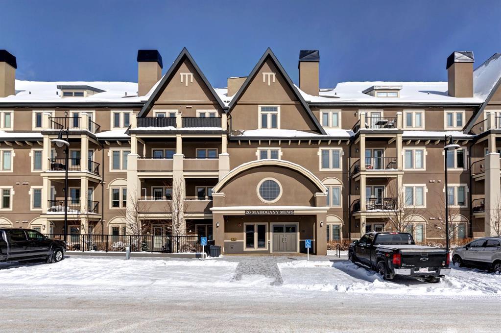 Welcome to the Sandgate in the stunning lake community of Mahogany. This SOPHISTICATED 2 bedroom 2 bath condo boasts a bright open floor plan. LUXURY VINYL flooring will greet you at the foyer. The enormous GRANITE island is sure to take your breath away. ELEGANT white cabinetry. Pantry and SLEEK stainless steel appliances. This well thought out floor plan offers separation between the two bedrooms. The LARGE master bedroom will comfortably fit your KING SIZED bed and furniture. Walk through closet and 3 piece ensuite with granite countertop. The second bedroom will warmly welcome a Queen sized bed. 4 piece main bath with granite countertop. SPACIOUS laundry room with additional storage. Never mind those hot summer days. This condo is equipped with IN UNIT AIR CONDITIONING. FIRE UP the GRILL from the convenience of your balcony. Equipped with a Gas BBQ outlet. TITLED underground parking stall with additional caged storage area. This BEAUTIFULLY DESIGNED building offers it's residents a LIBRARY on the second floor, a massive BICYCLE storage room in the parkade, BBQ GRILL rental and PICNIC AREA to the right of the building, GYM in building 10 and 2 GUEST rental suites. You will appreciate the quick access from 52 street to your new home. The Sandgate is also conveniently located within walking distance to professional services, Sobey's, multiple restaurants, and entertainment. Start your day with an amazing breakfast at the Broken Yolk or Diner Deluxe. Enjoy a walk or bike ride along the extensive pathways throughout this beautiful community. Spend the day at THE MAHOGANY BEACH CLUB and the CENTRAL BEACH SITE. Residents have exclusive access to the sandy beaches, splash park, tennis courts, beach volleyball courts, outdoor hockey rink, a fishing pier and non-motorized marina, barbecue pits, indoor gymnasium and more... Book your dinner reservation at Chairman's Steak House or take in an evening of food and entertainment at Alvin's Jazz club. This complex lends a wealth of opportunity for those with an active lifestyle or entering their retirement years. Schedule your viewing today and call this home your own.